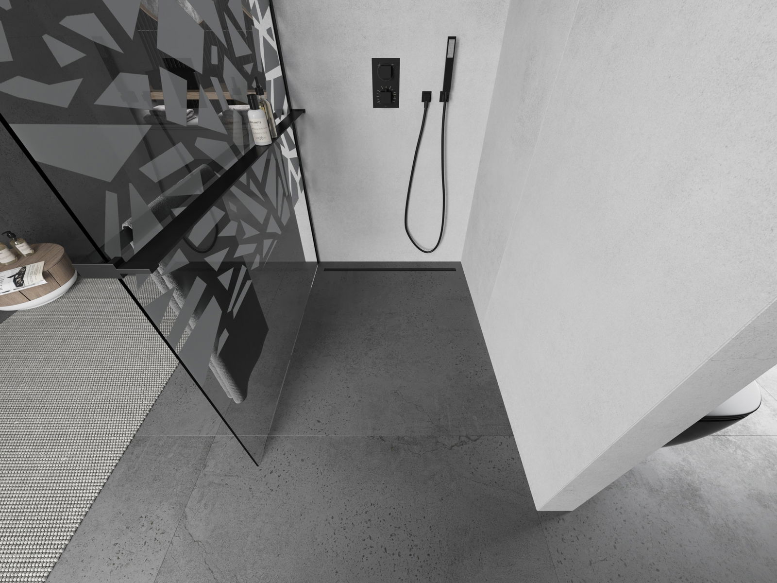 Mexen Kioto+ duša sienas ar plauktu Walk-in 90 x 200 cm, balts raksts, melns - 800-090-121-70-85