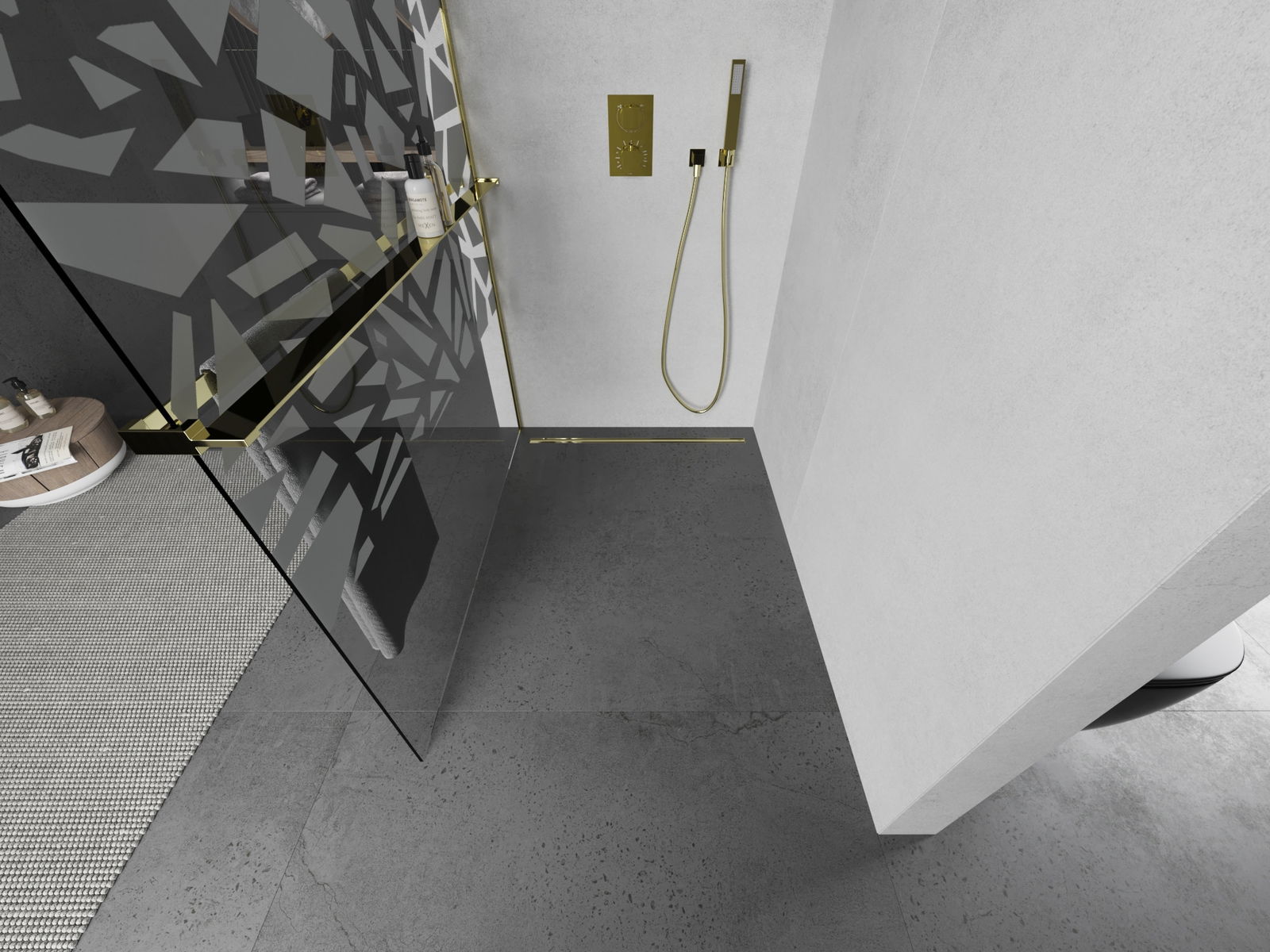Mexen Kioto+ dušas siena ar plauktu Walk-in 90 x 200 cm, balts raksts, zelta - 800-090-121-50-85