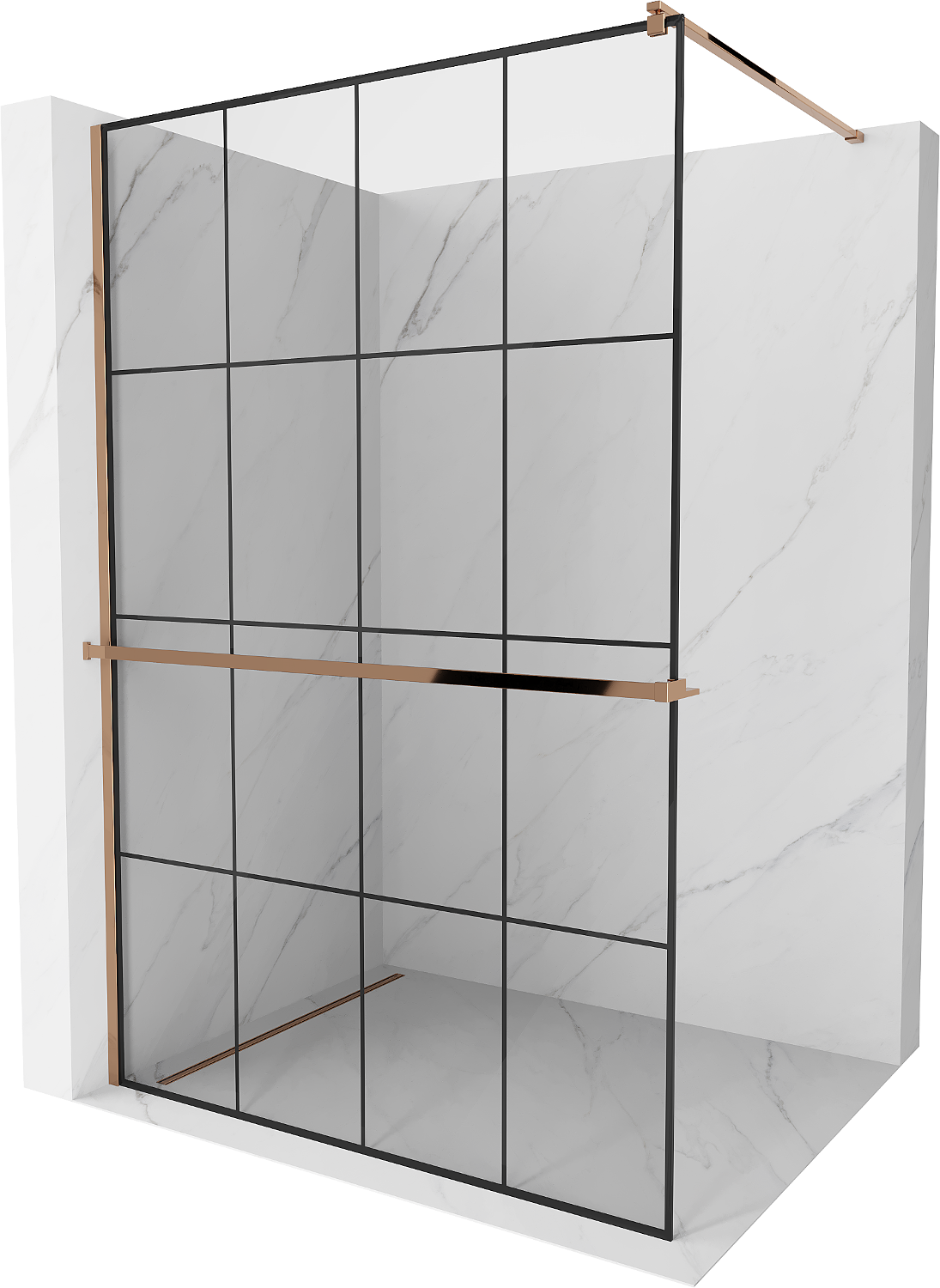 Mexen Kioto+ dušas siena ar plauktu Walk-in 140 x 200 cm, melns režģis, rozā zelts - 800-140-121-60-77