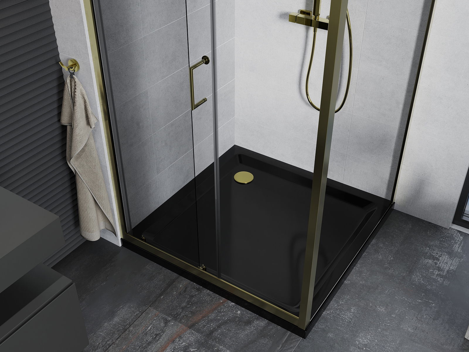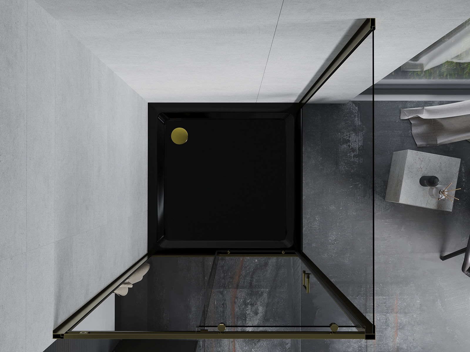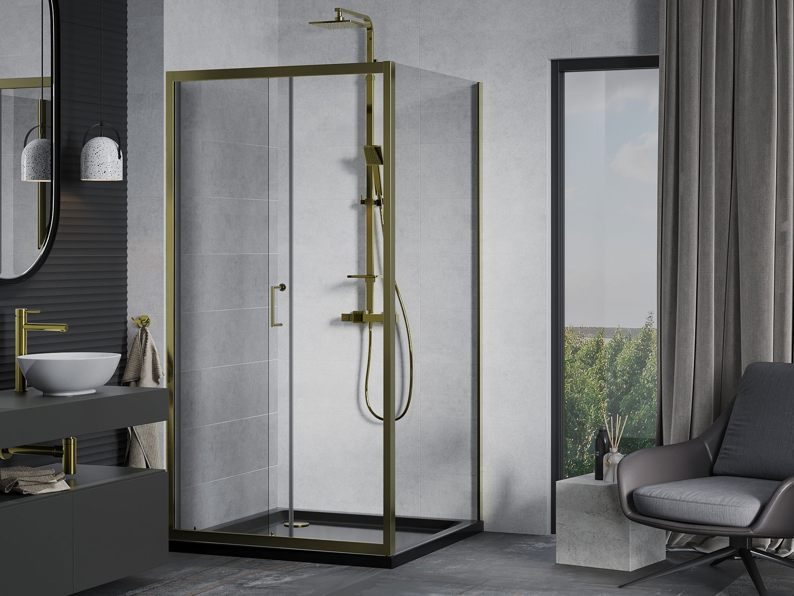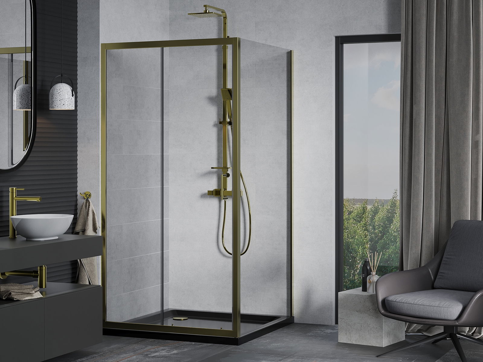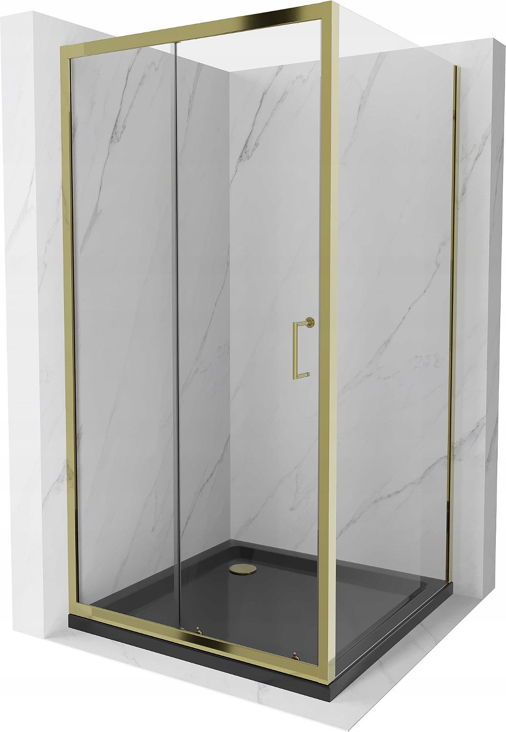 Mexen Apia bīdāmā dušas kabīne 100 x 100 cm, caurspīdīga, zelta + Flat paliktnis, melns - 840-100-100-50-00-4070G