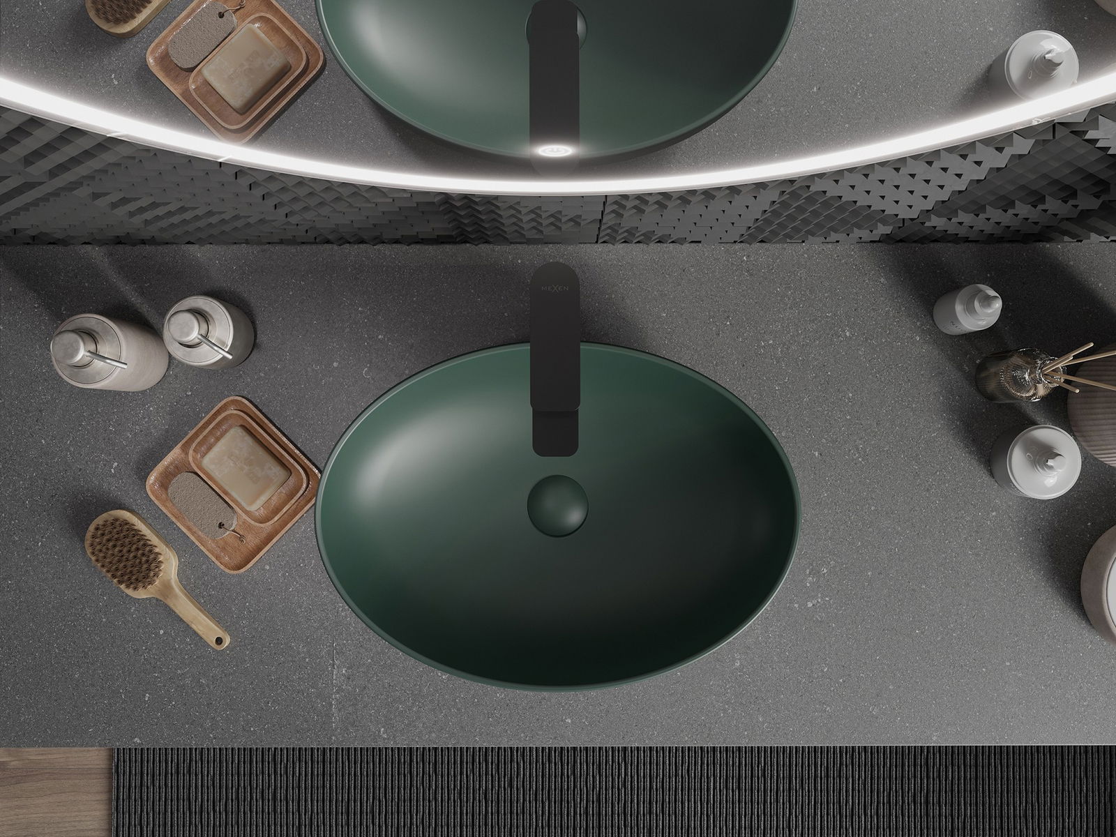 Matētā keramikas virsma lieliski uzsver izstrādājuma krāsas raksturu, piešķirot tam unikālu un izteiksmīgu apdari. Smalkā matētās keramikas struktūra vannas istabā ienes eleganci, radot estētisku telpu.