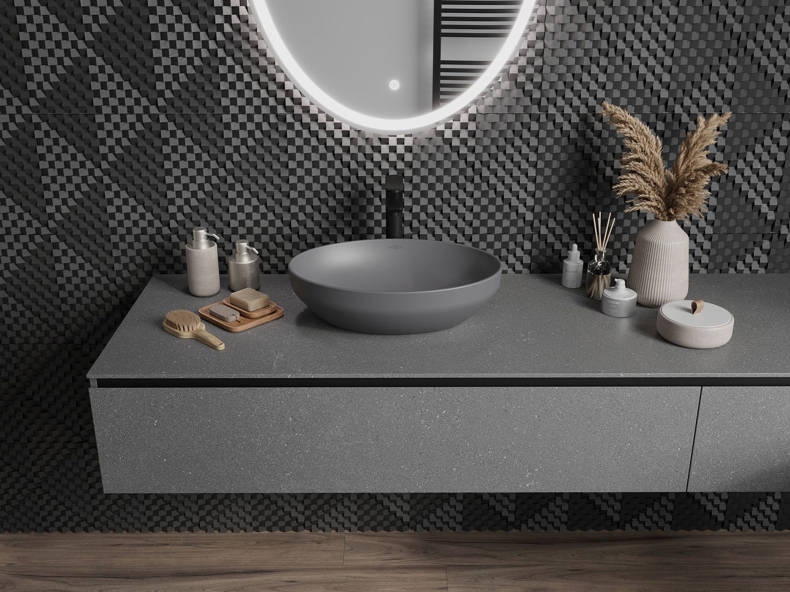 Matētā keramikas virsma lieliski uzsver izstrādājuma krāsas raksturu, piešķirot tam unikālu un izteiksmīgu apdari. Smalkā matētās keramikas struktūra vannas istabā ienes eleganci, radot estētisku telpu.