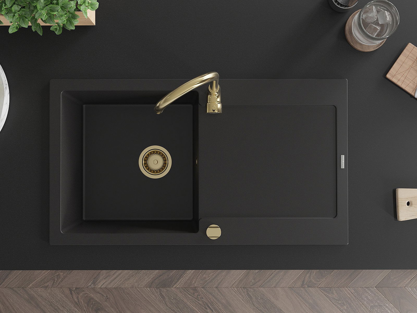 Izlietnei ir 2 daļēji izurbtas atveres ar diametru 35 mm, kuras var pašrocīgi izsist. Tās var izmantot, piemēram, šķidruma dozatora uzstādīšanai, kas novērsīs plastmasas pudeļu klātbūtni virtuvē un piešķirs tai elegantu apdari.