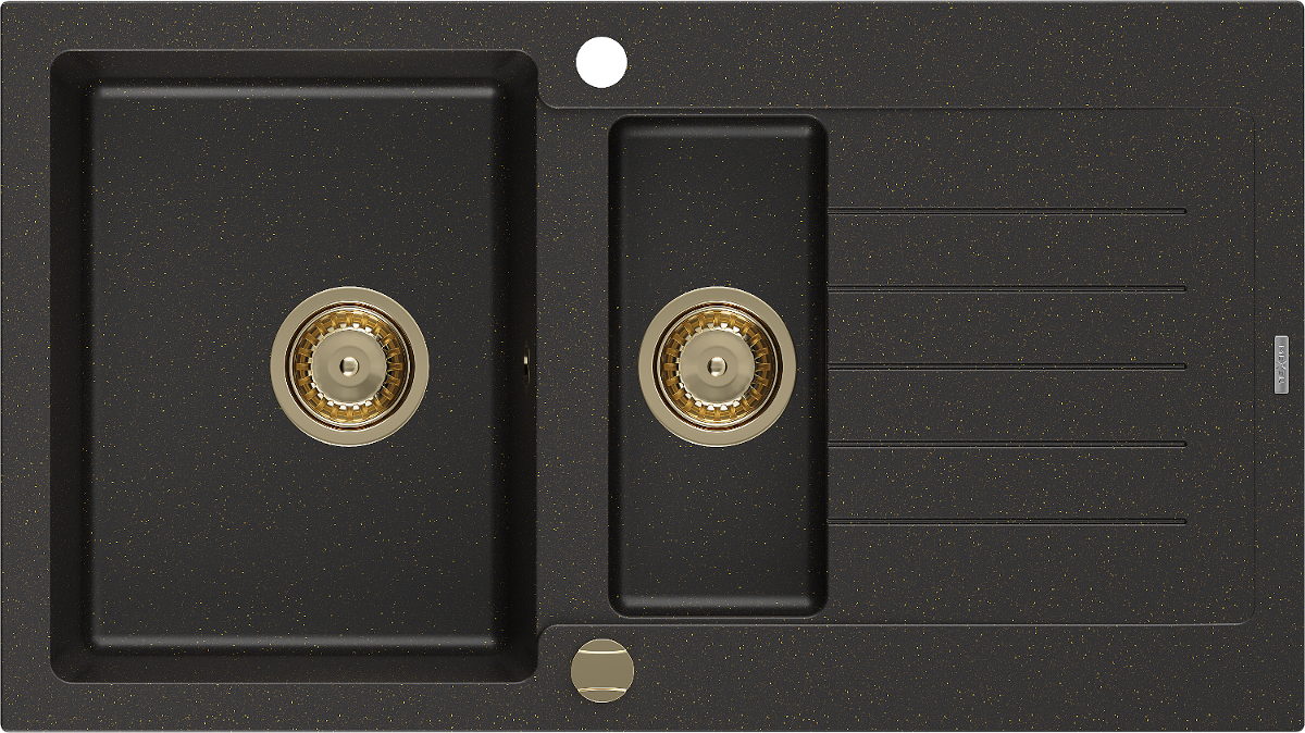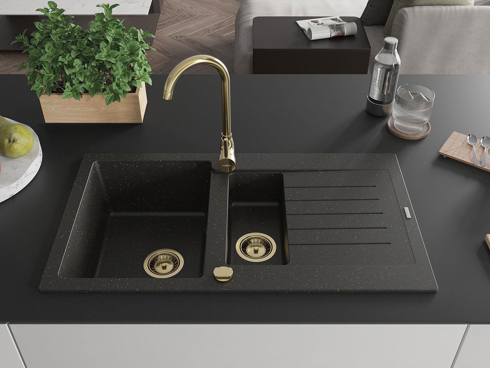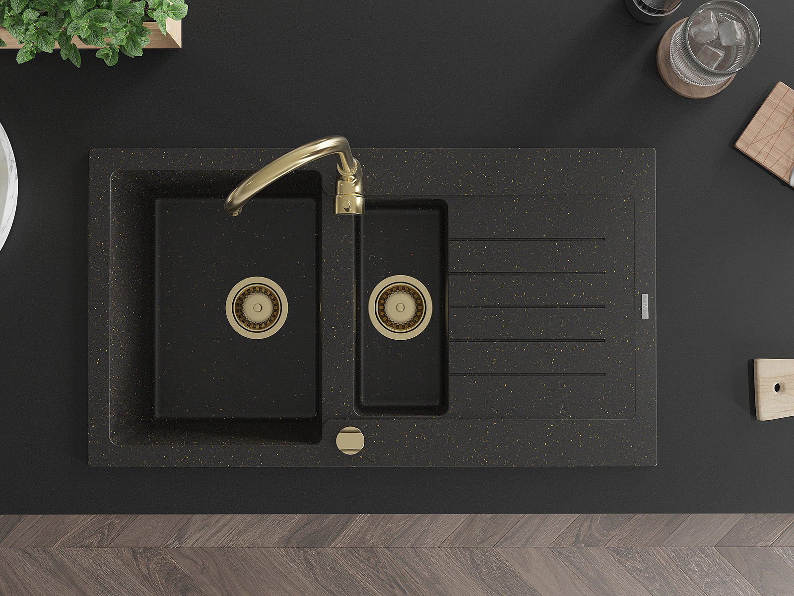Mexen Matias granitizlietne ar vienu un pusi nodalījumu un noteces plati 900 x 505 mm, melna/zeltains metālika, sifons zelts