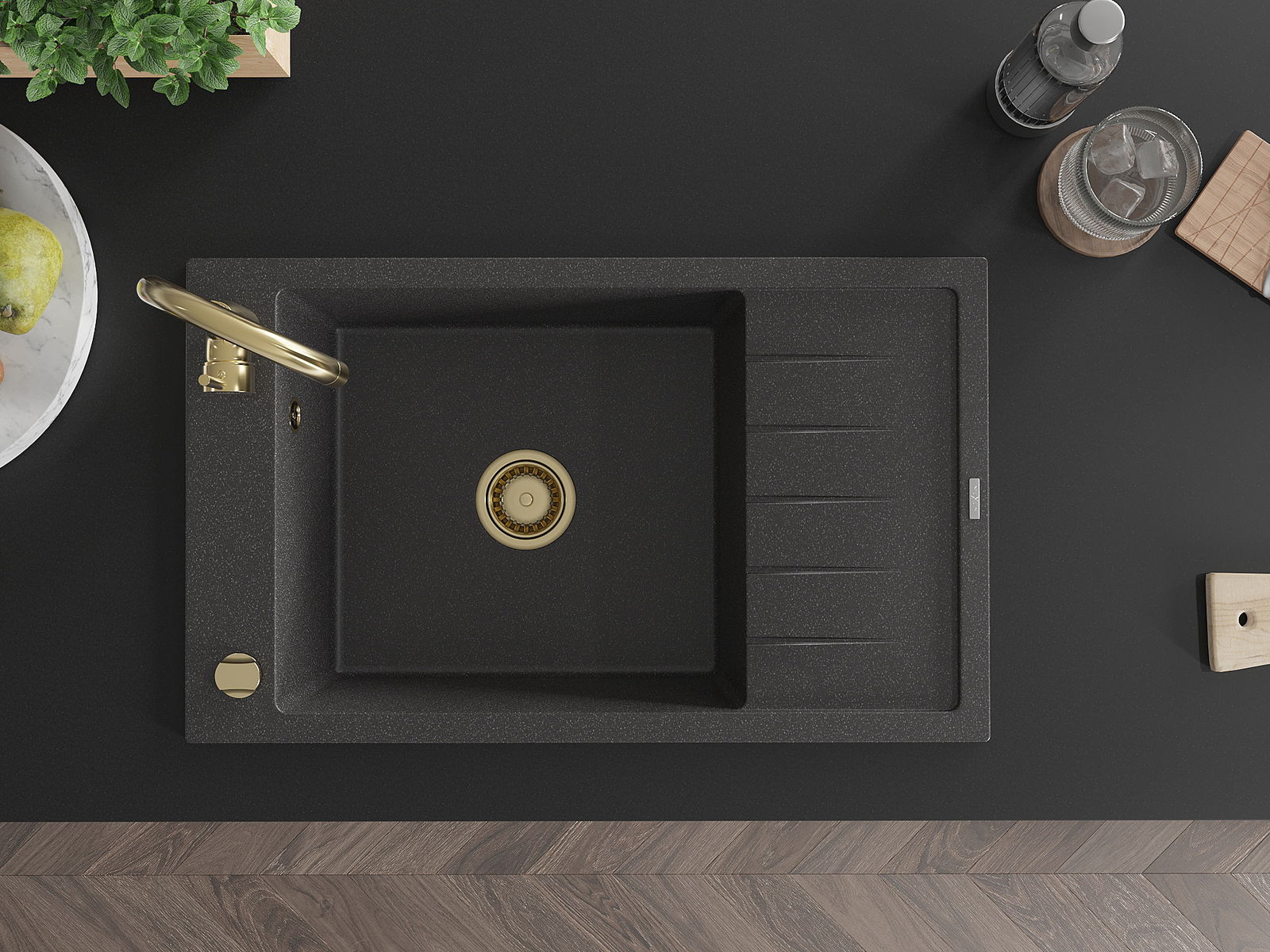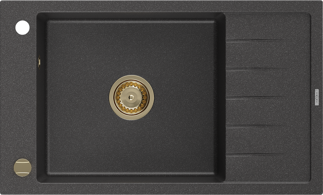 Mexen Elias 1-kameru granīta izlietne ar noteces paliktni 795 x 480 mm, melna raiba, zelta sifons - 6511791005-76-G