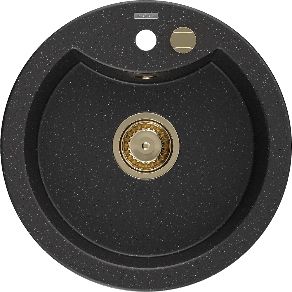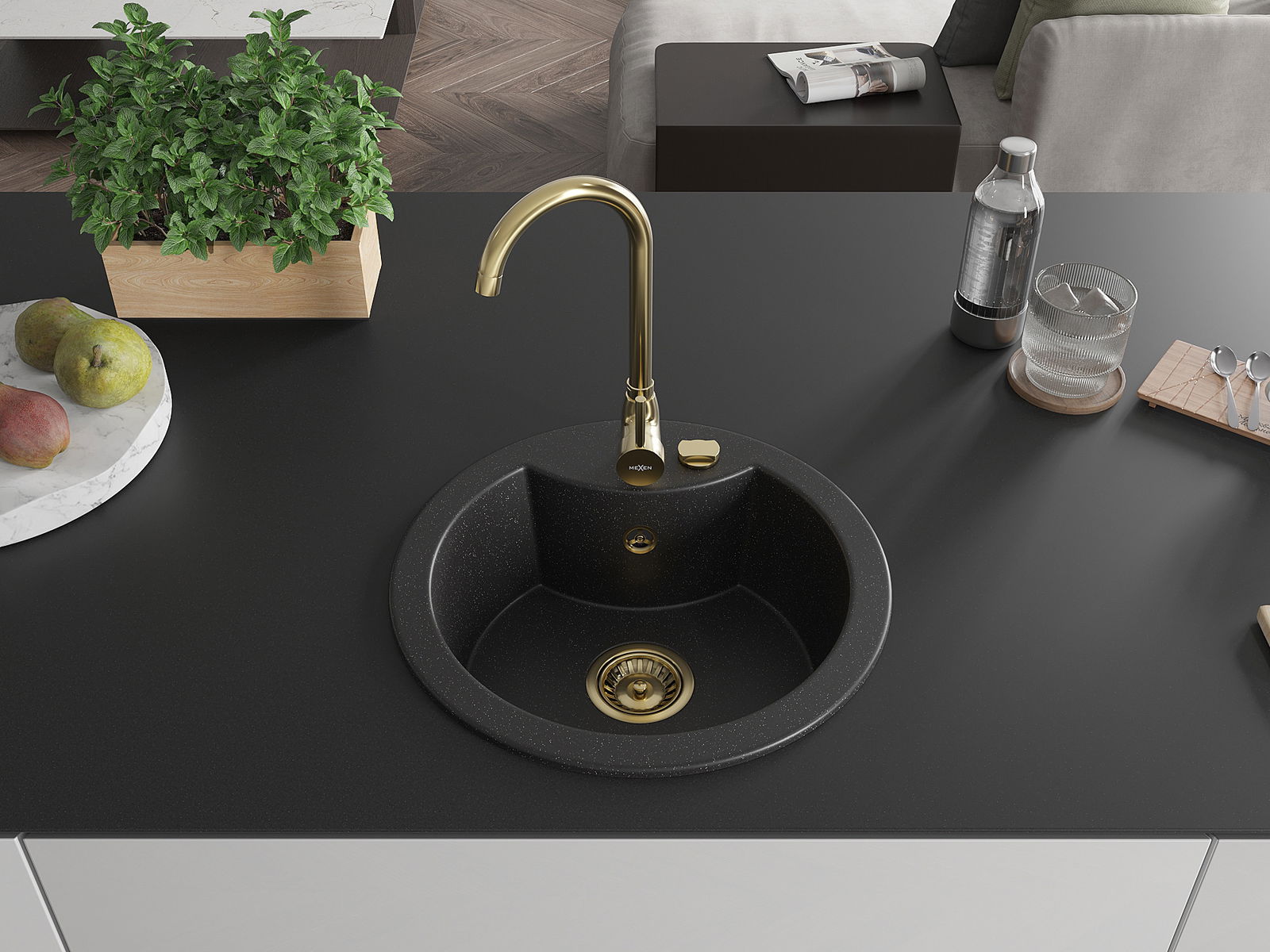 Mexen Diego granitais izlietne, 1 nodalījums, 488 x 480 mm, melna/sudraba metālika, zelta sifons - 6512481000-73-G