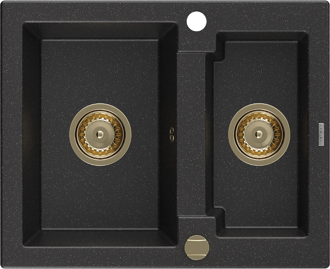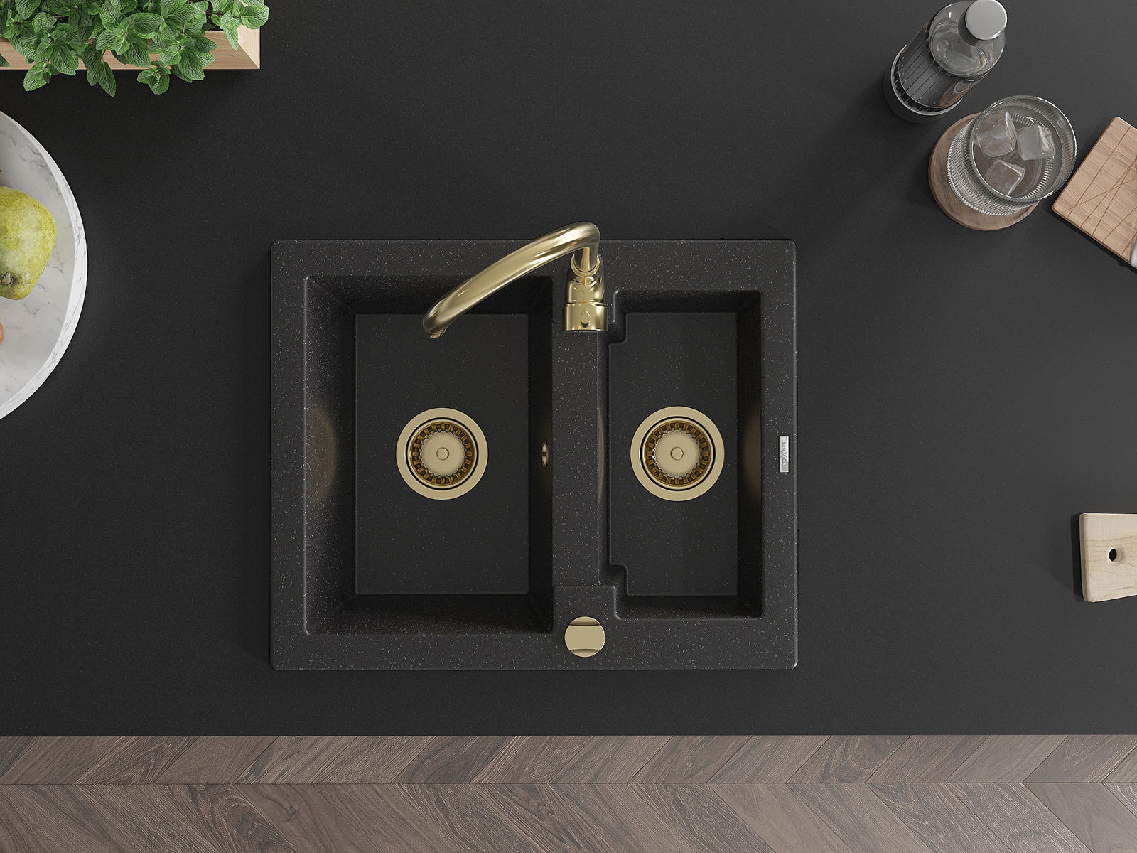 Mexen Carlos granīta izlietne, 1,5 nodalījuma, 582 x 475 mm, melns/sudrabs metālisks, zelta sifons - 6518581500-73-G