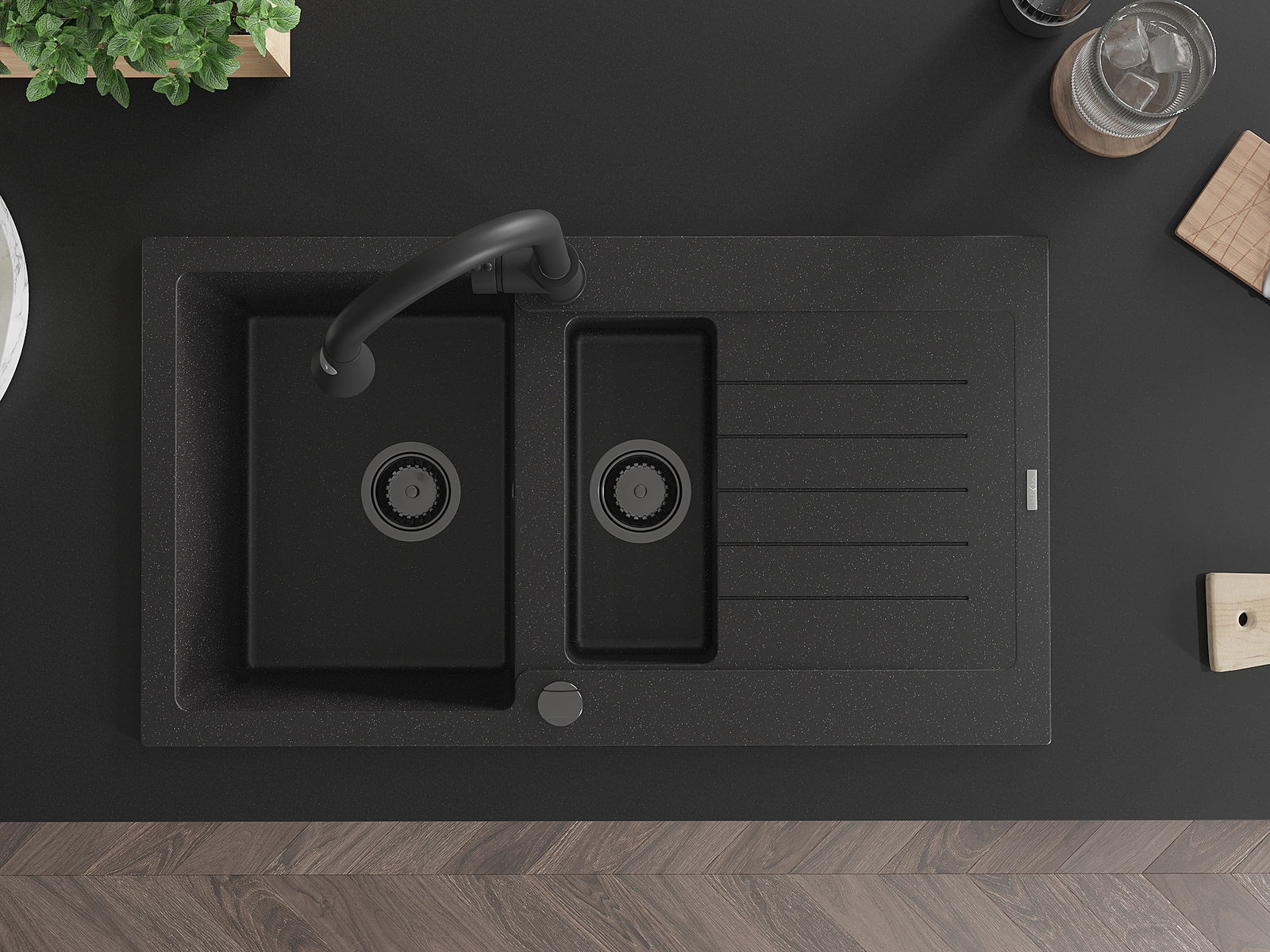 Mexen Matias granitizlietne 1,5 sekciju izlietne ar noteku 900 x 505 mm melna/sudraba metālisks, sifons melns - 6502901505-73-B