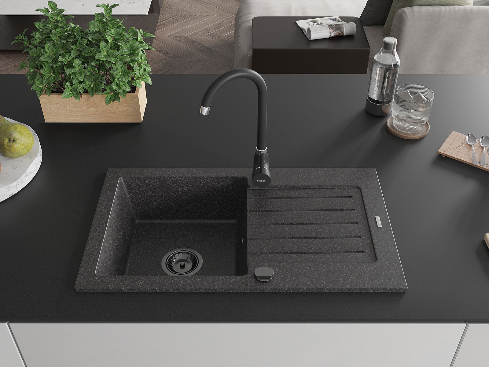 Mexen Pablo granitais izlietne ar vienu nodalījumu un noteci 752 x 436 mm, melna ar plankumiem, melns sifons - 6510751010-76-B