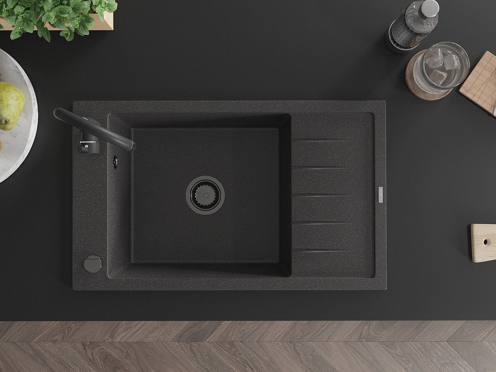 Mexen Elias granitizlietne izlietne ar vienu nodalījumu un noteci 795 x 480 mm, melna ar plankumiem, melns sifons