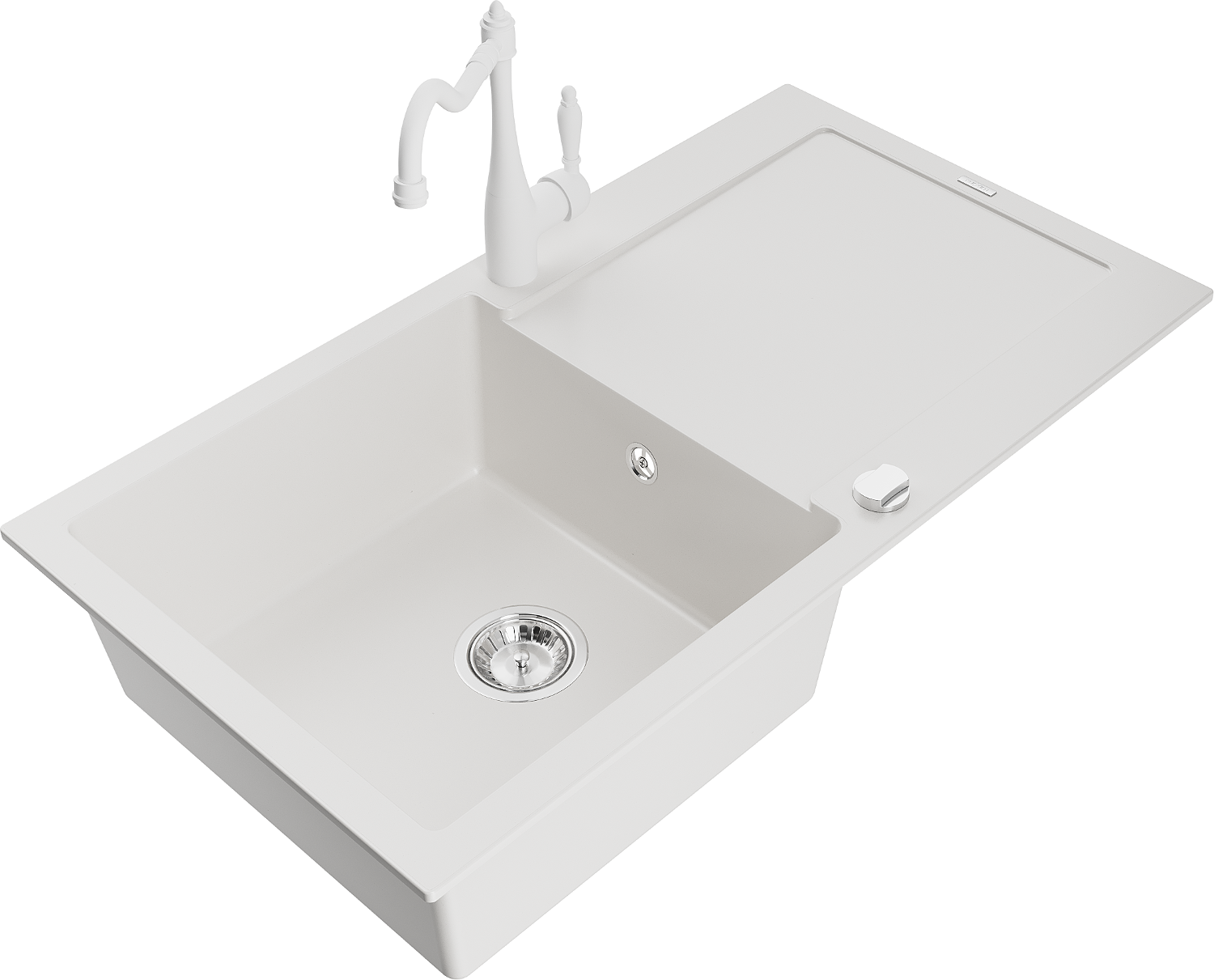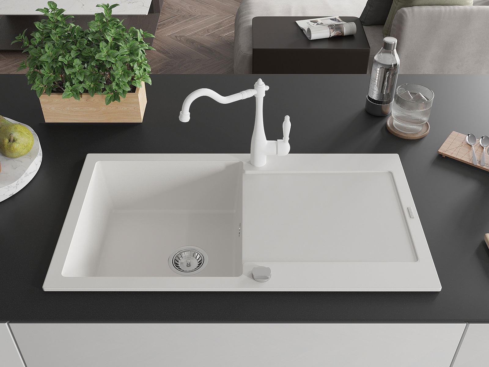Mexen Leo granīta izlietne ar vienu nodalījumu, notekpaplāti un virtuves jaucējkrānu Carla, balts - 6501-20-670700-20