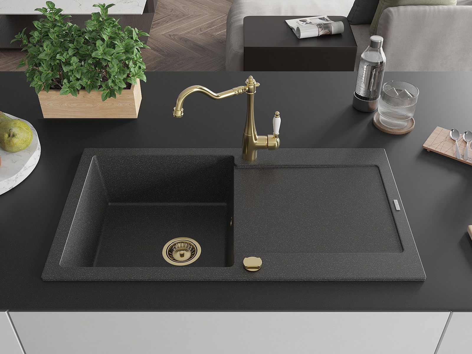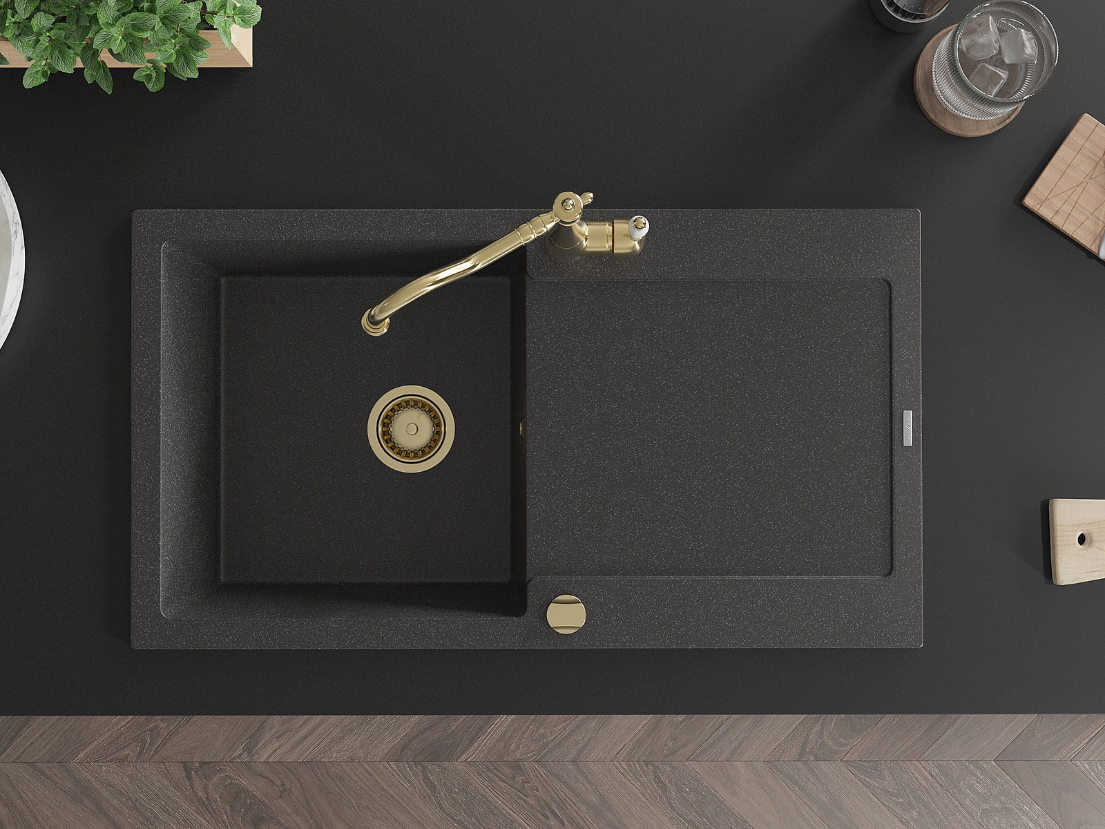 Mexen Leo Granitā izlietne ar vienu nodalījumu ar noteku un virtuves jaucējkrānu Carla, melna ar plankumiem - 6501-76-670700-50
