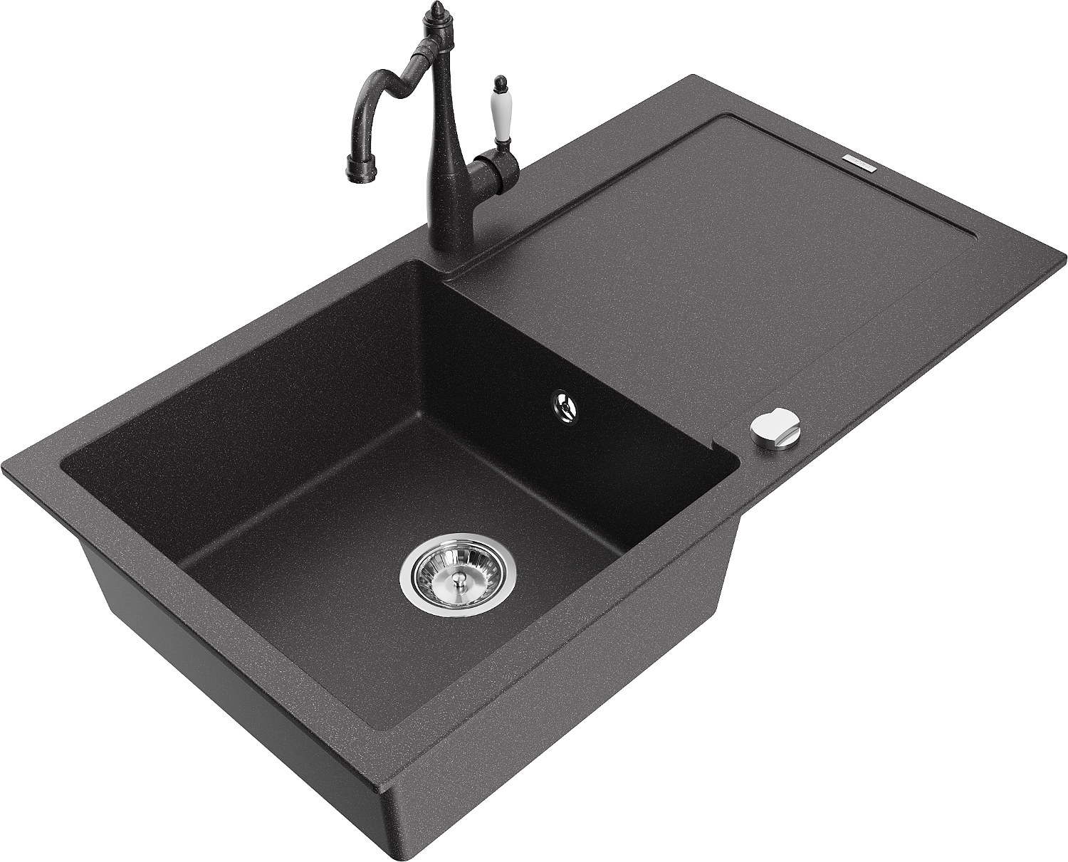 Mexen Leo granit izlietne ar vienu nodalījumu ar notekplati un izlietnes maisītāju Carla, melna ar punktiem