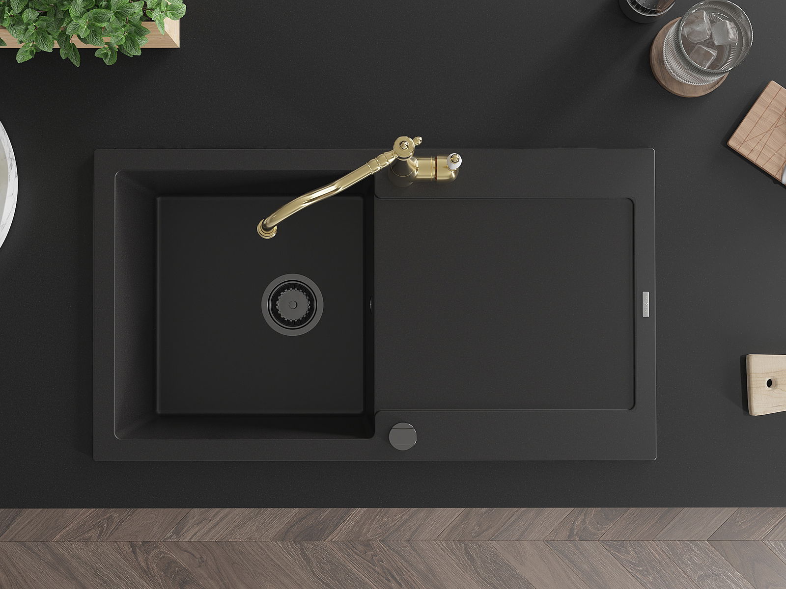 Izlietnei ir 2 daļēji izurbtas atveres ar diametru 35 mm, kuras var pašrocīgi izsist. Tās var izmantot, piemēram, šķidruma dozatora uzstādīšanai, kas novērsīs plastmasas pudeļu klātbūtni virtuvē un piešķirs tai elegantu apdari.