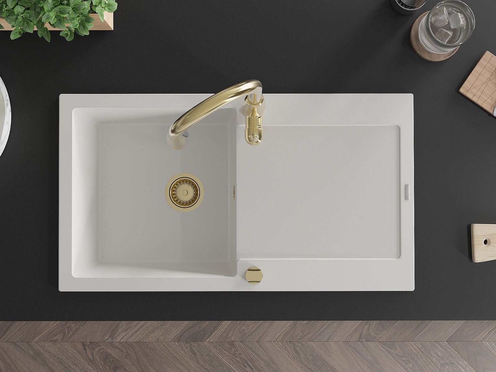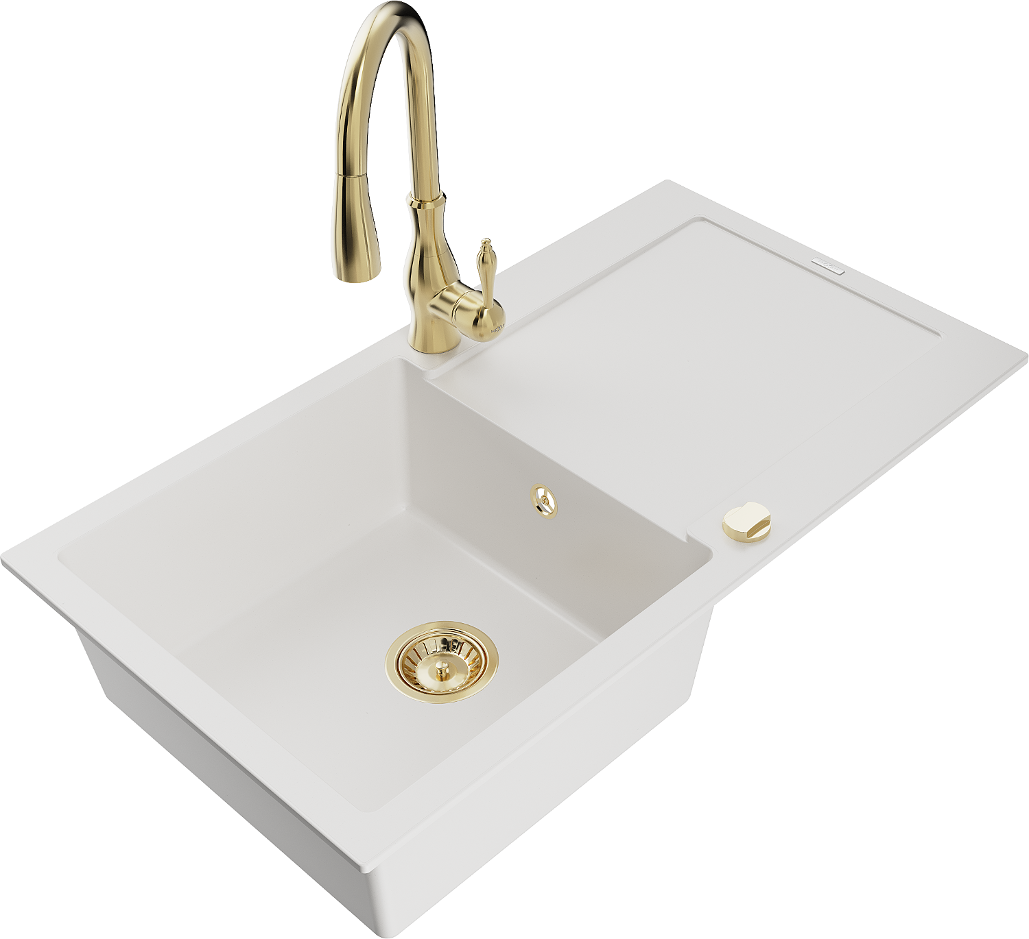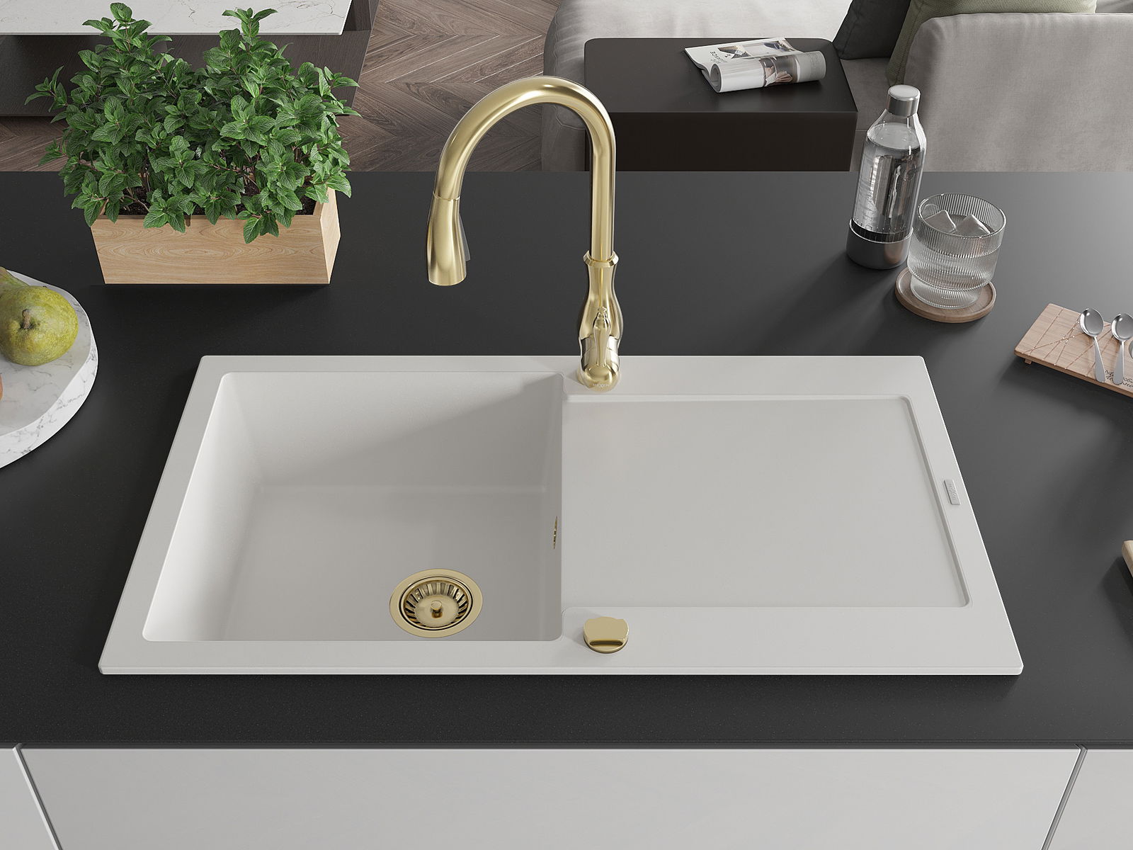 Mexen Leo granitizlietne 1-komoru izlietne ar notekplati un virtuves jaucējkrānu Savita, balts - 6501-20-672601-50