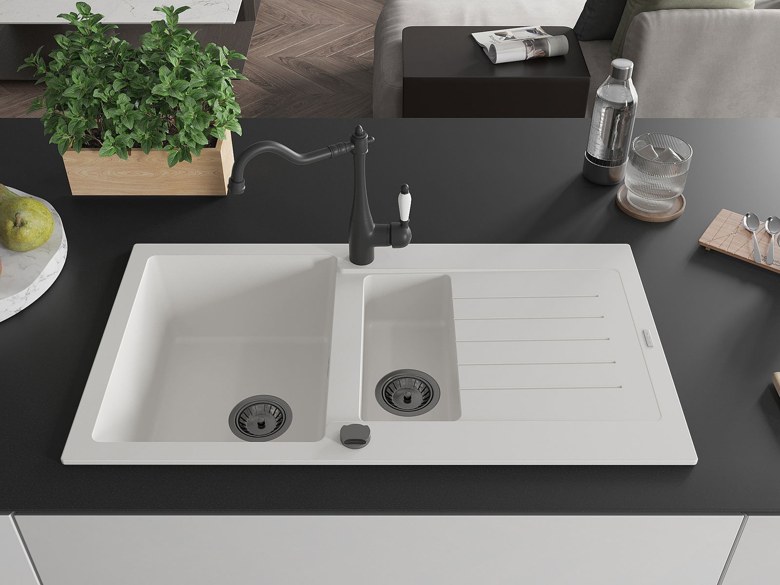 Mexen Matias granitā izlietne ar 1,5 nodalījumiem un noteku, virtuvei, balta - 6502-20-670700-70