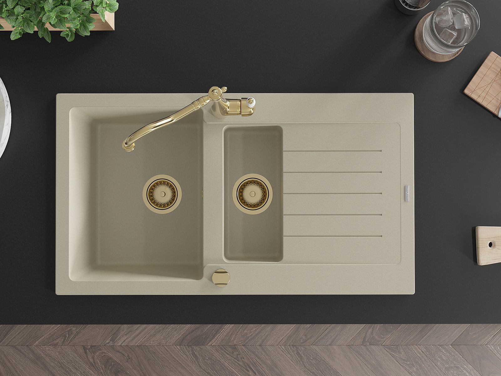 Mexen Matias granitizlietne izlietne ar 1,5 nodalījumu un krāniņu Carla, bēša - 6502-69-670700-50