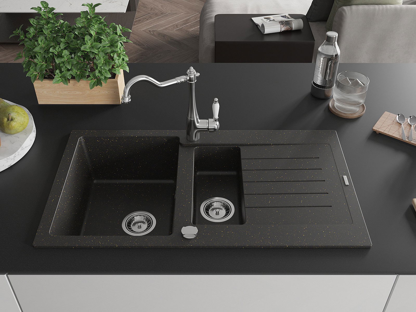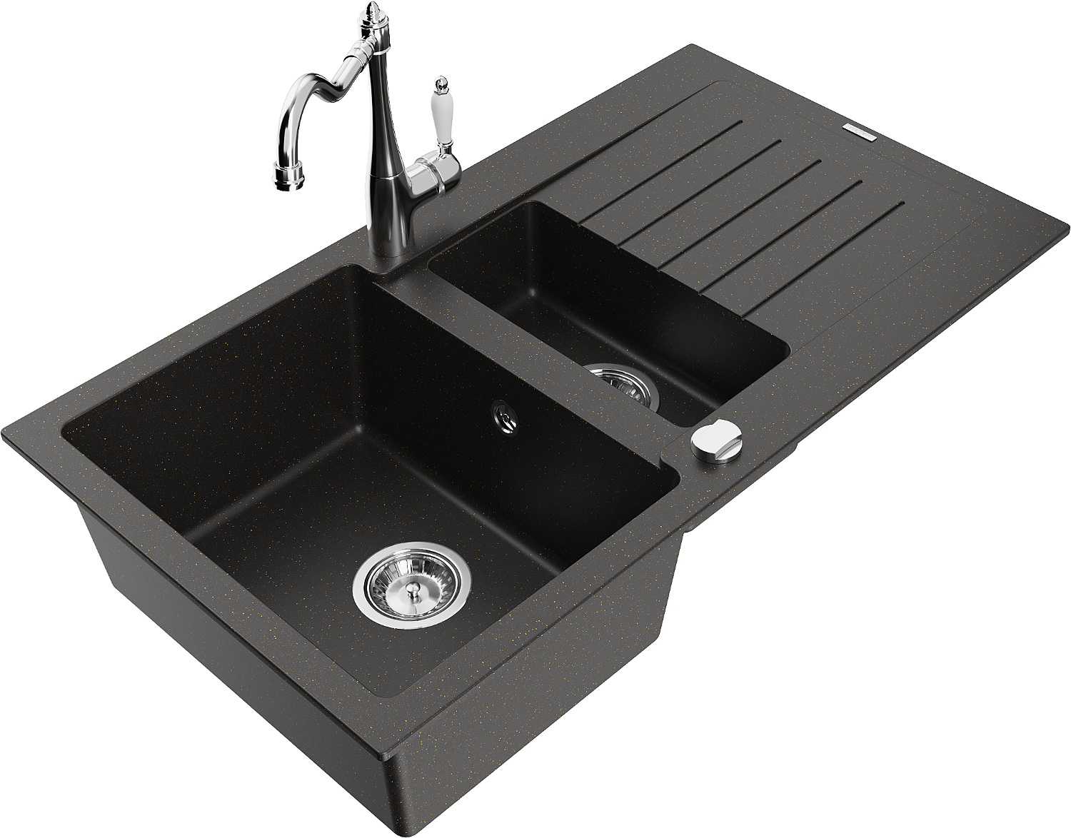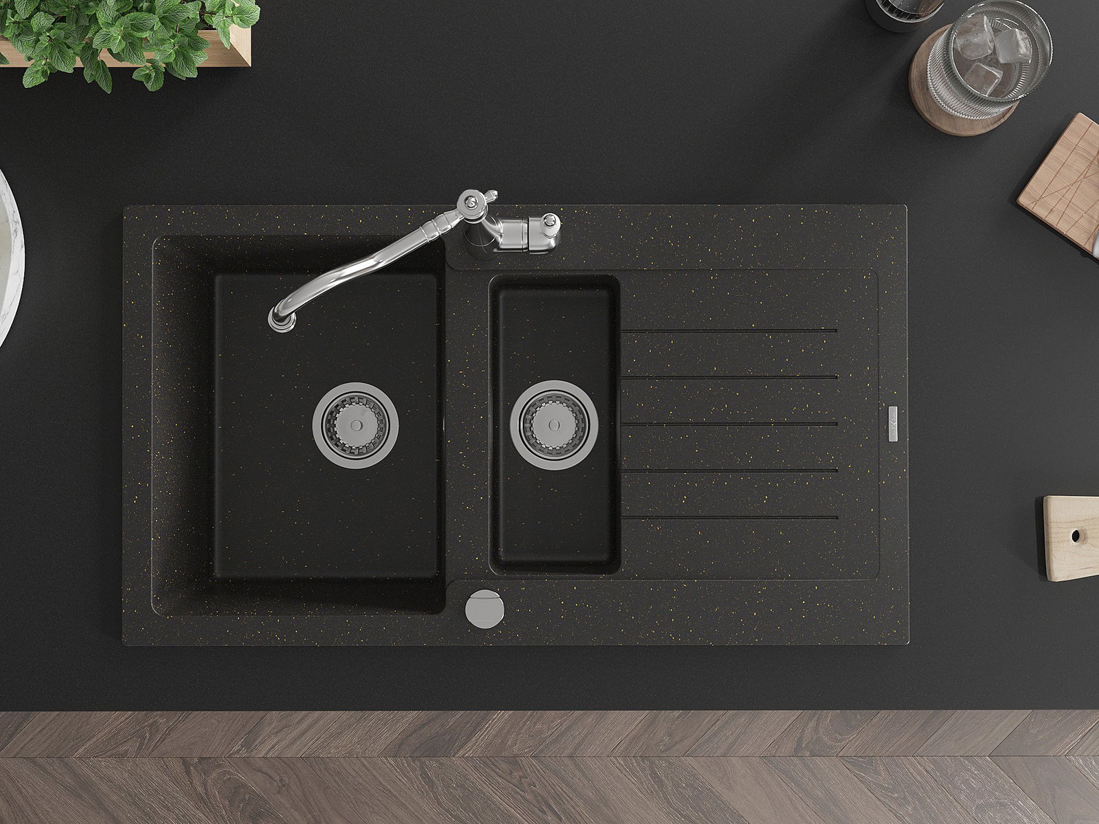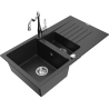 Mexen Matias granitē izlietne ar 1,5 kamerām, ar noteci un virtuves krānu Carla, melna/zeltaina metālika - 6502-75-670700-00