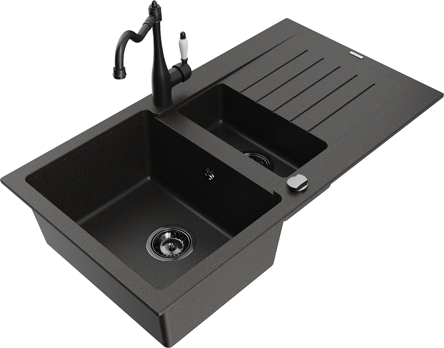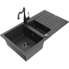 Mexen Matias granitizlietne ar 1,5 nodalījumiem ar notecētāju un virtuves jaucējkrāns Carla melns/zeltains metālisks
