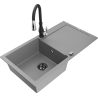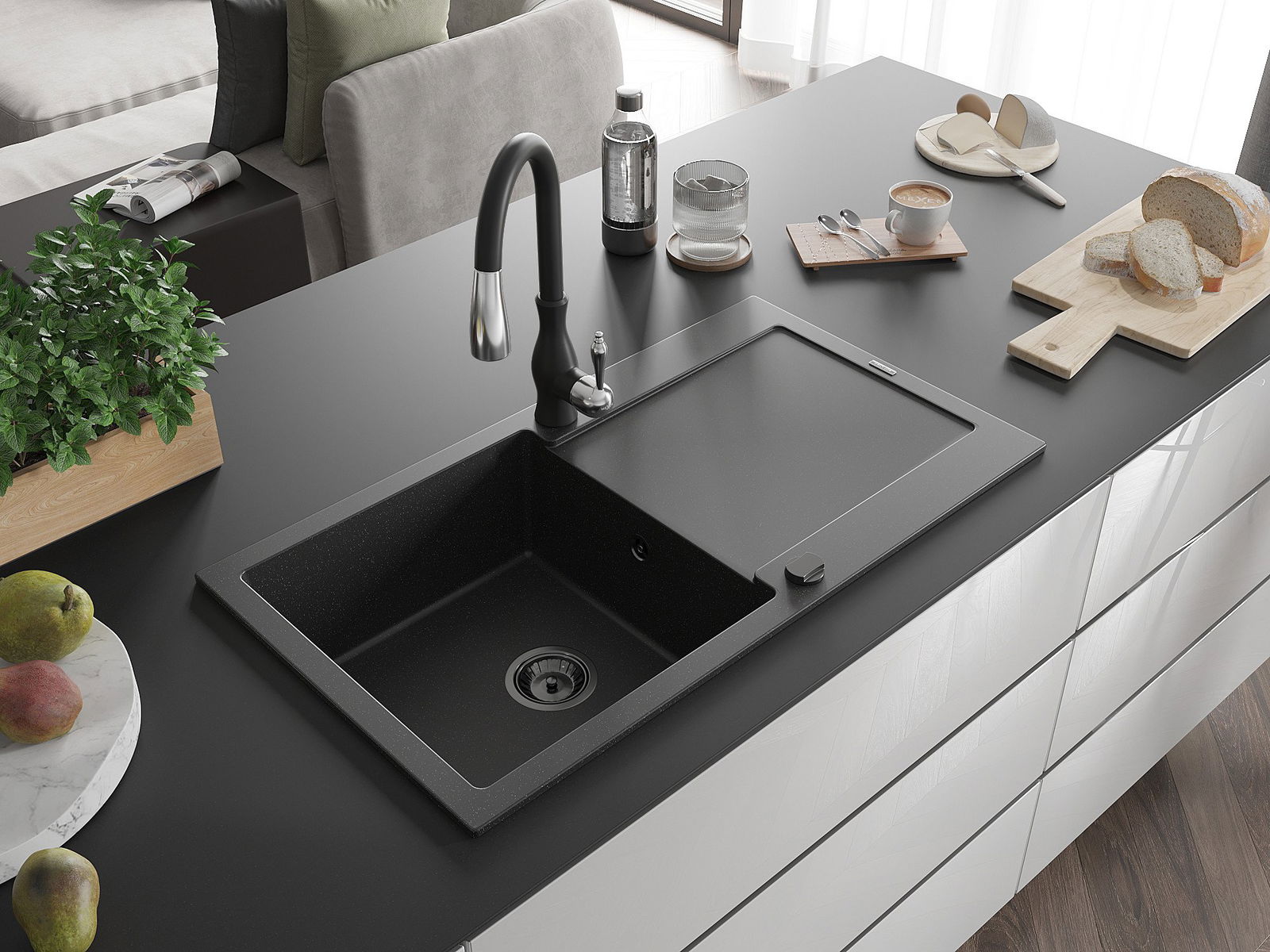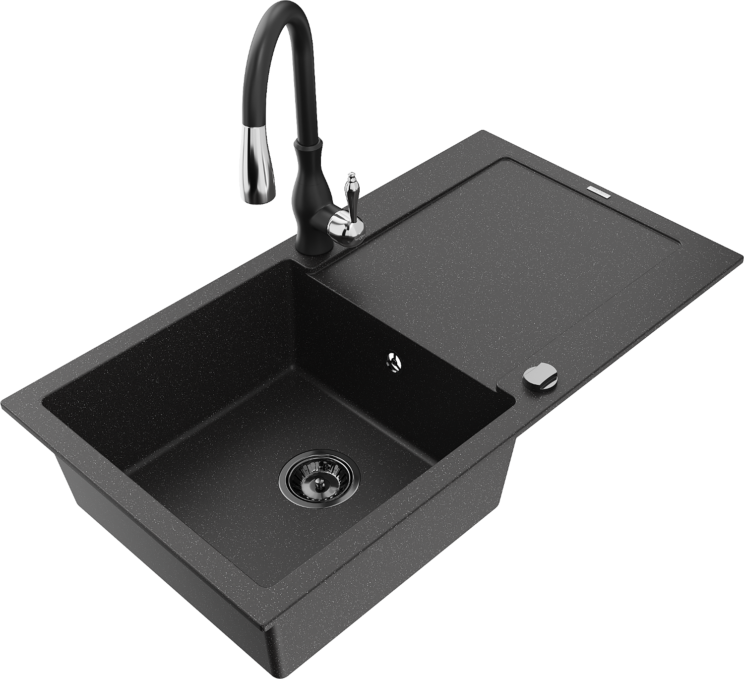 Mexen Leo granitizlietne 1-kanālu ar noteces un virtuves jaucējkrānu Savita, melna/sudraba metālika - 6501-73-672601-70-B