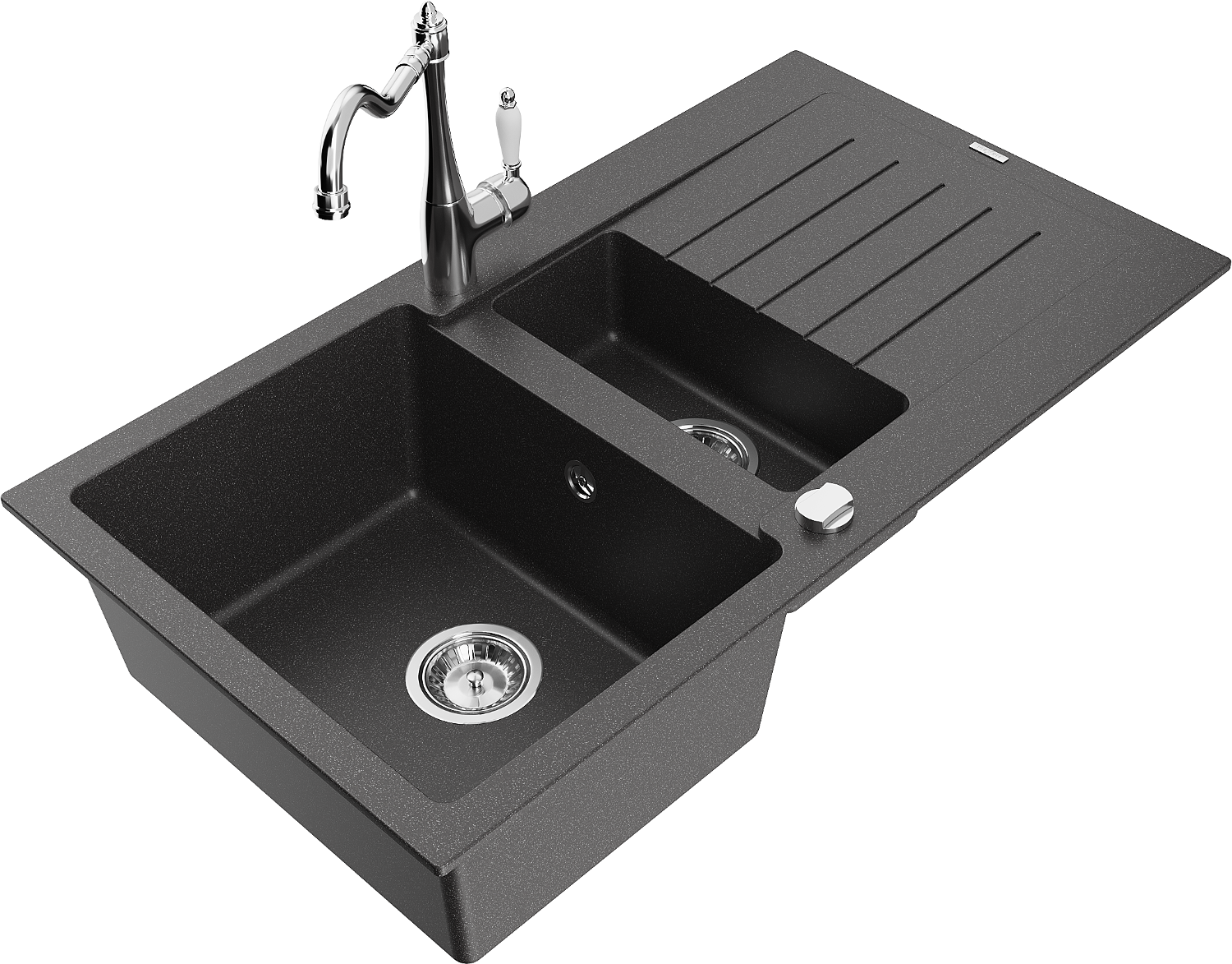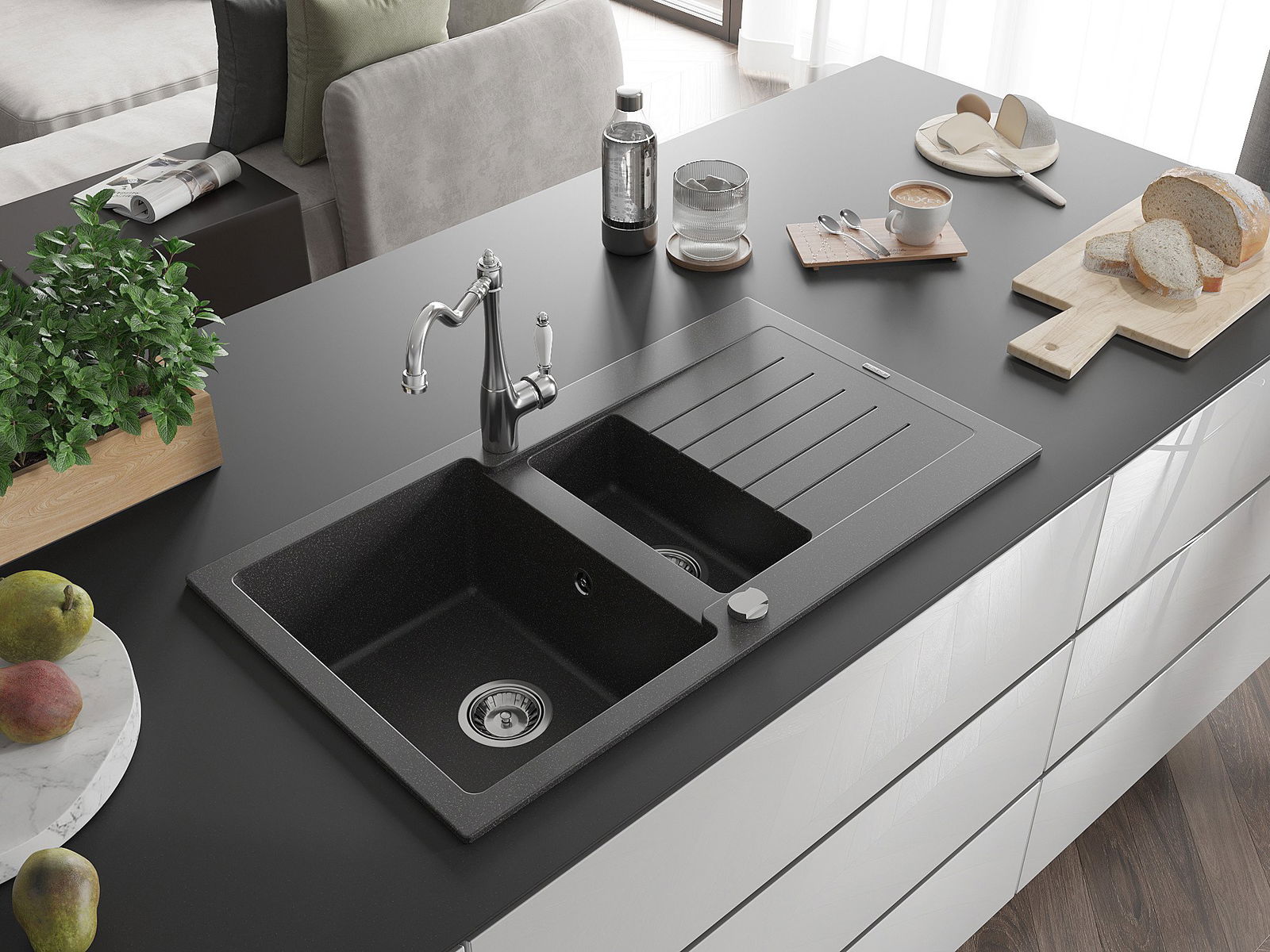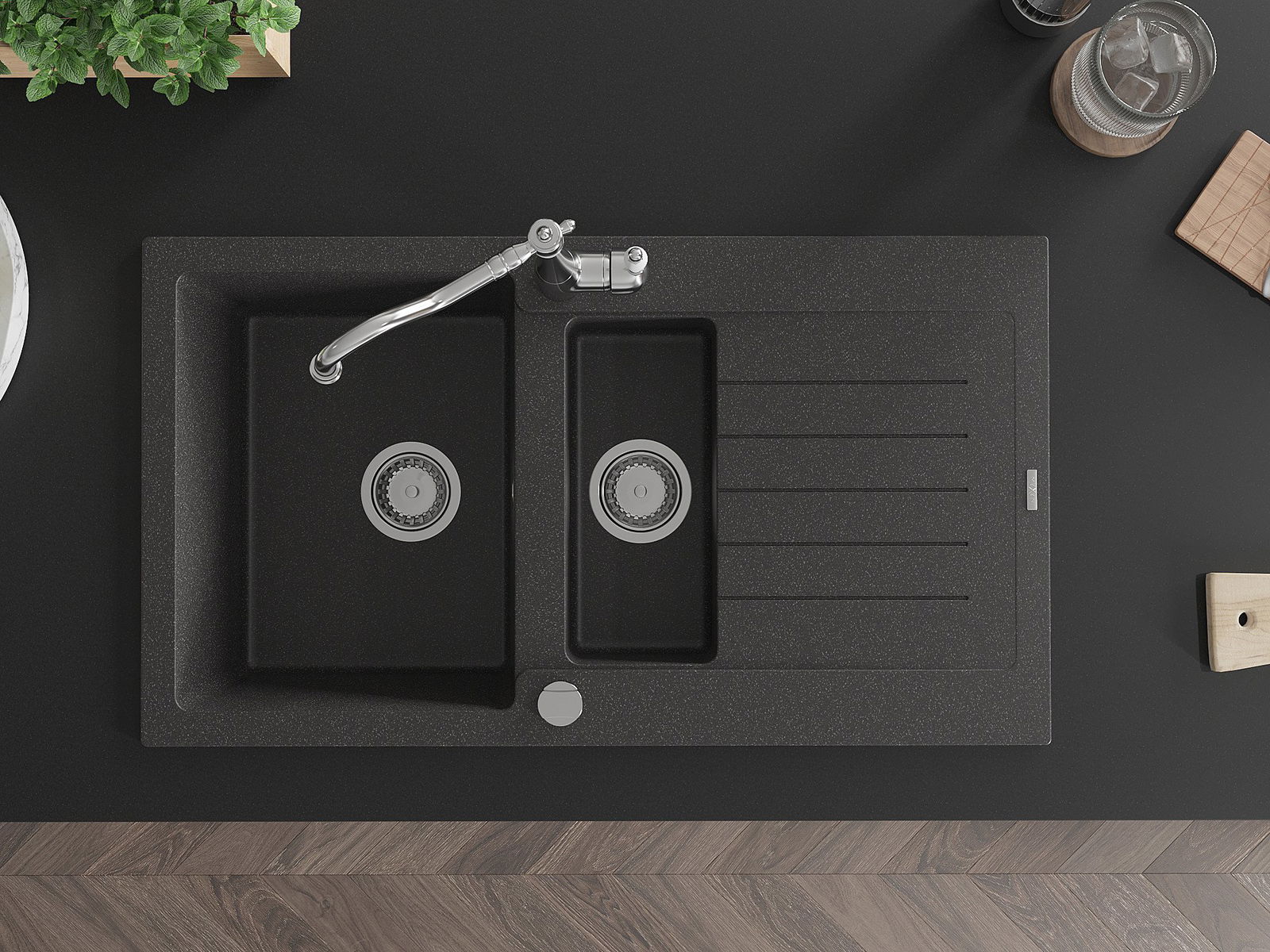 Mexen Matias granīta izlietne ar 1,5 nodalījumiem un noteku, un virtuves jaucējkrānu Carla, melna ar punktiem