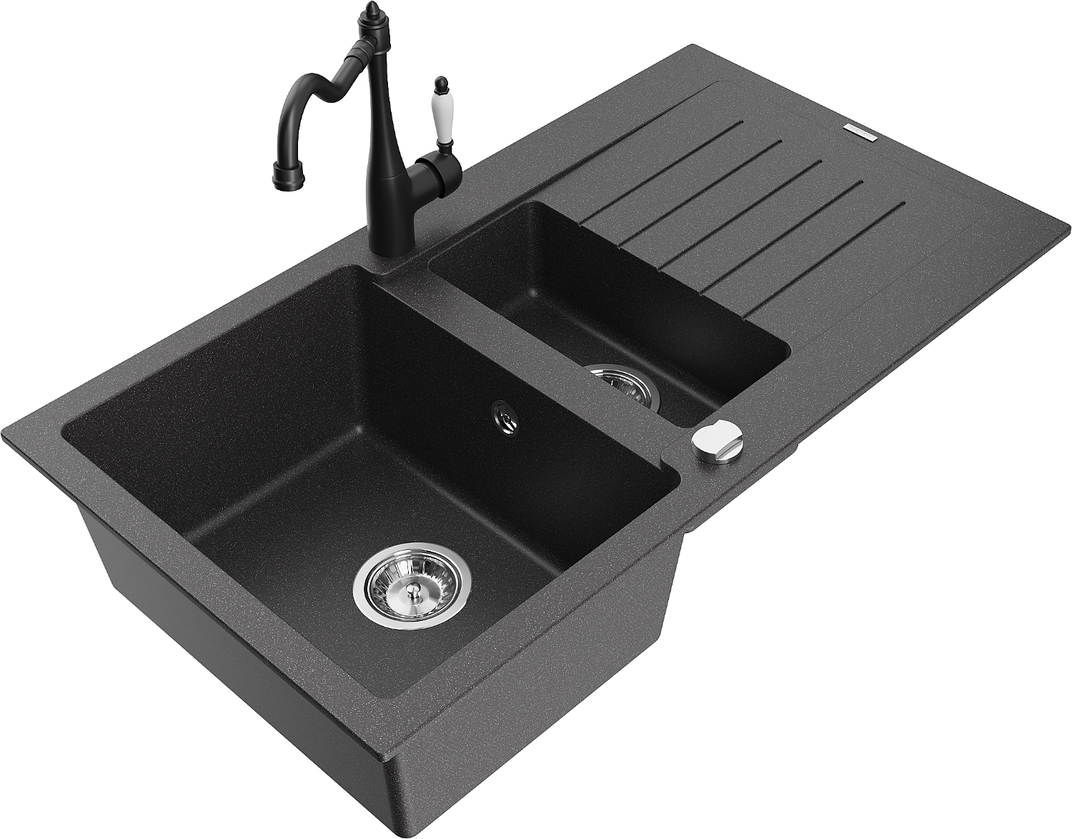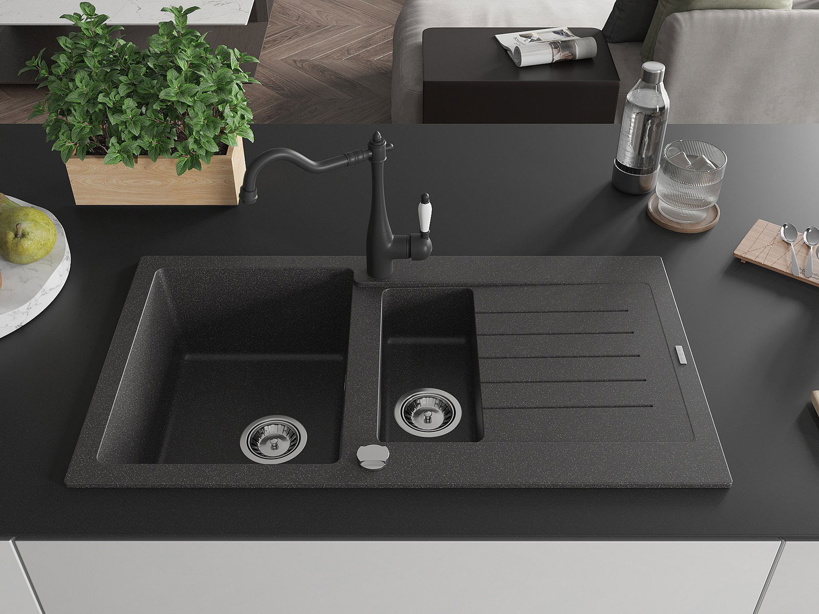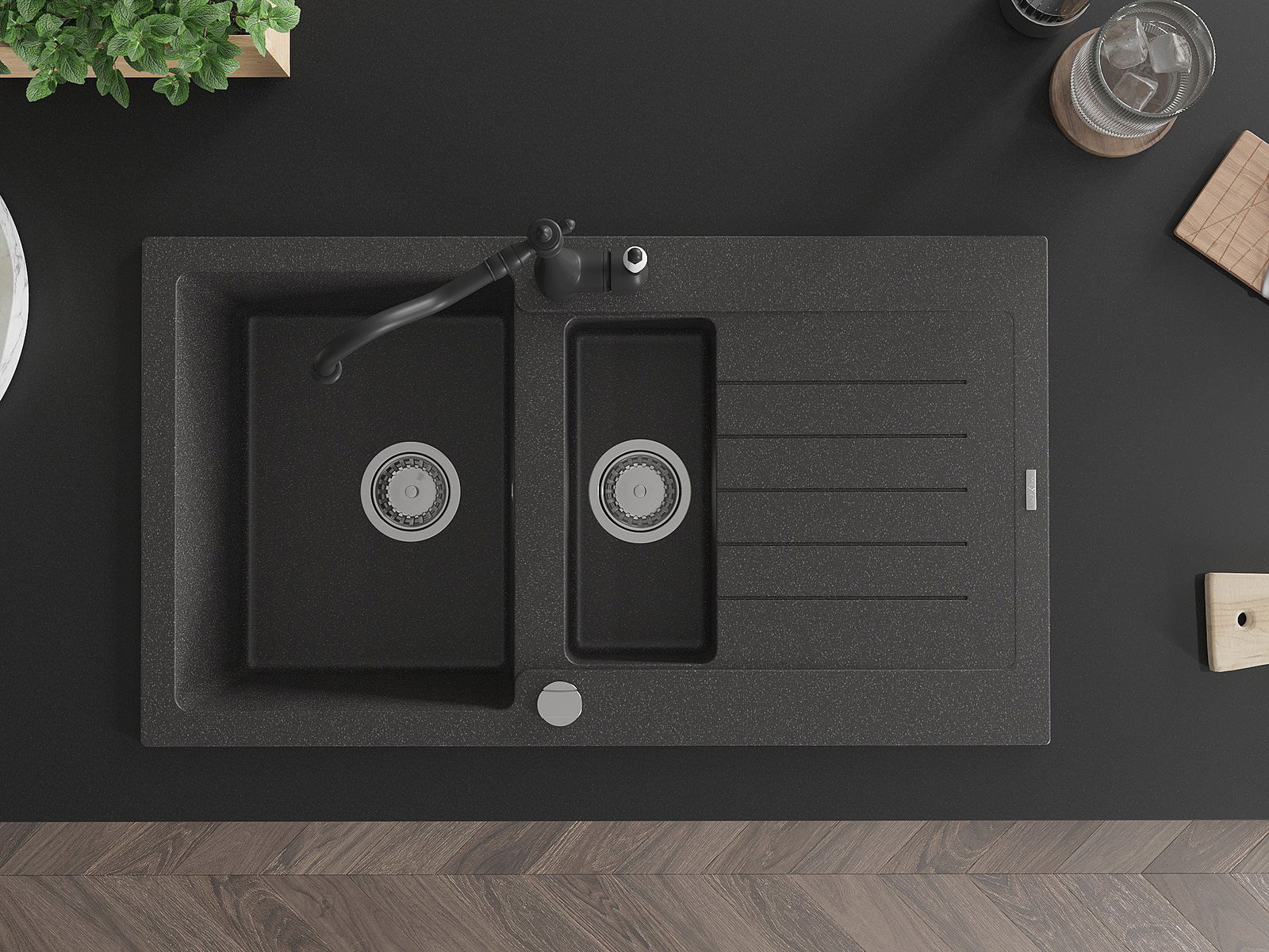 Mexen Matias 1,5 kamera granīta izlietne ar notecētāju un virtuves jaucējkrānu Carla, melna ar plankumiem - 6502-76-670700-70