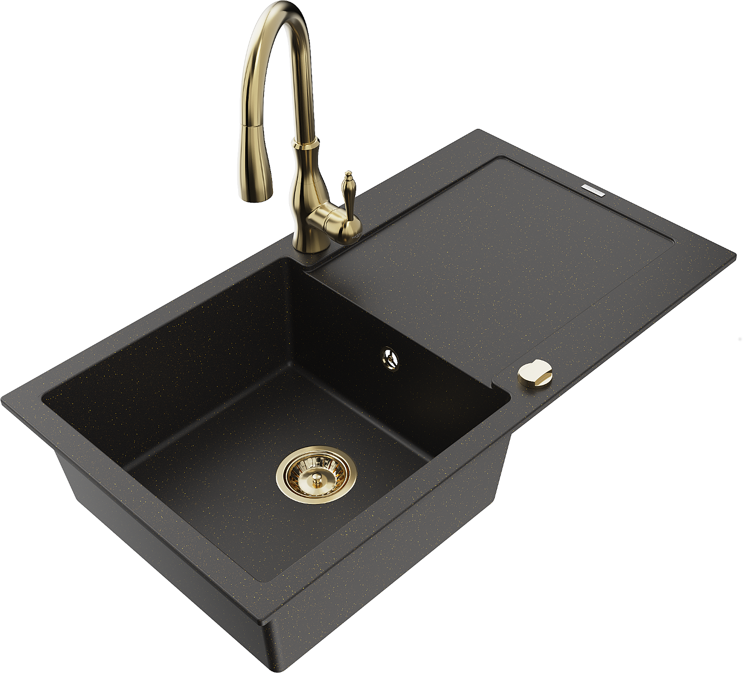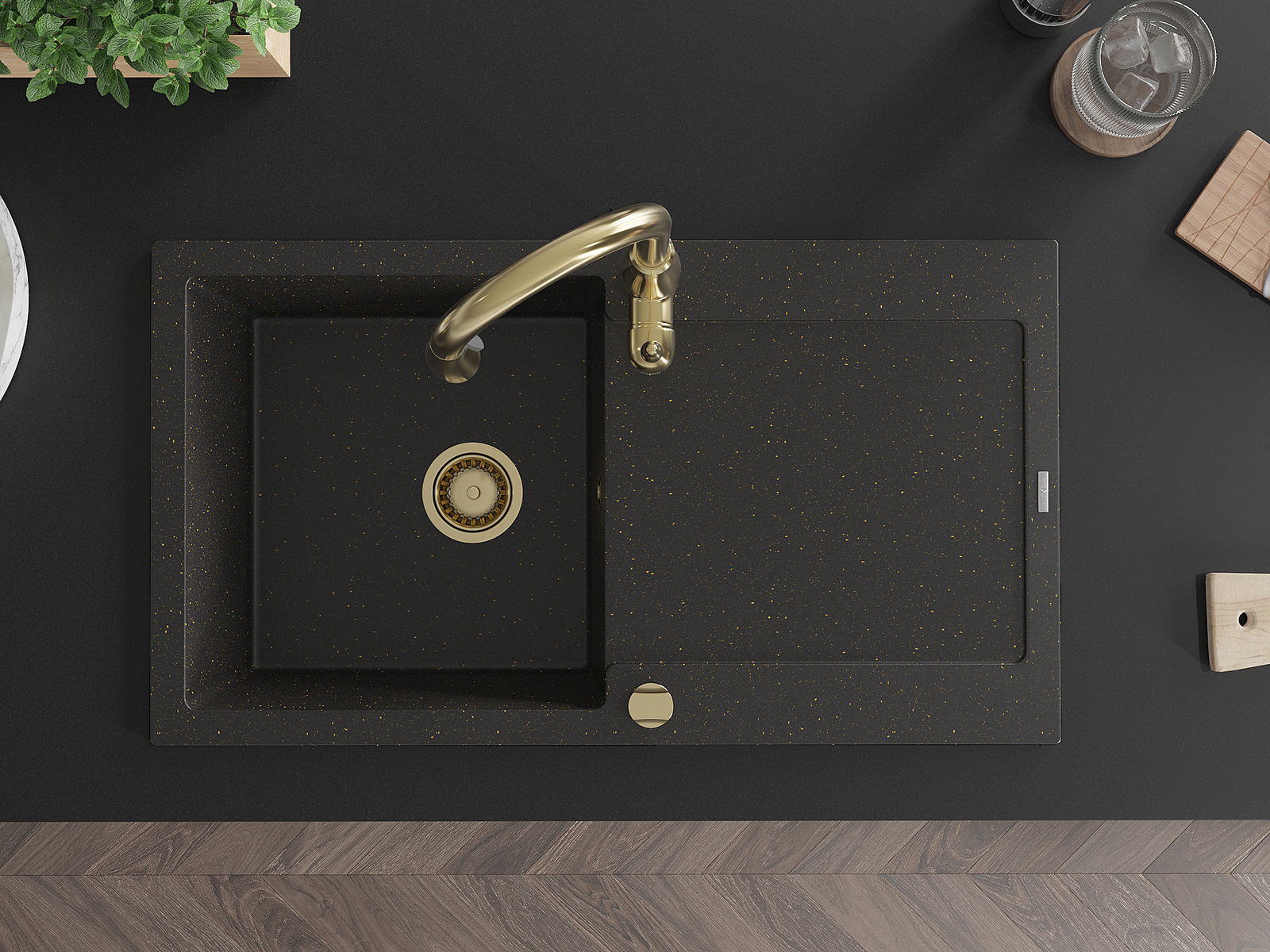 Mexen Leo granīta izlietne ar vienu nodalījumu ar noteces zonu un virtuves jaucējkrānu Savita, melns/zeltains metālika