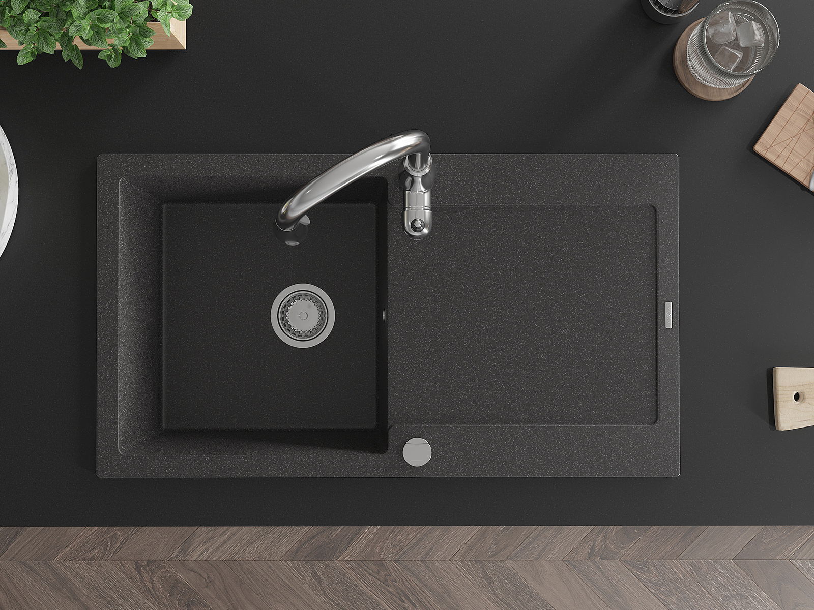 Mexen Leo granitizlietne ar vienu nodalījumu ar notekpaplāti un virtuves jaucējkrānu Savita, melns, raibs