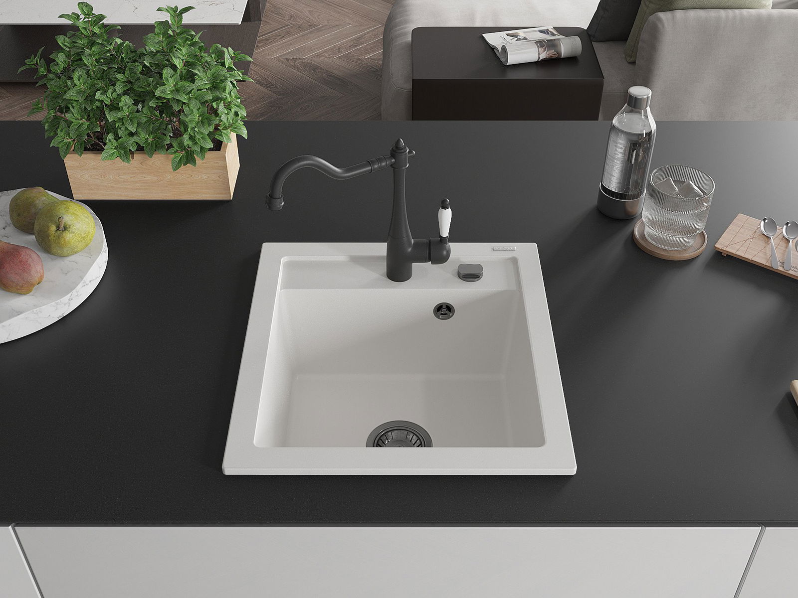 Mexen Vito granit izlietne ar vienu bļodu un Carla virtuves jaucējkrānu, balta - 6503-20-670700-70