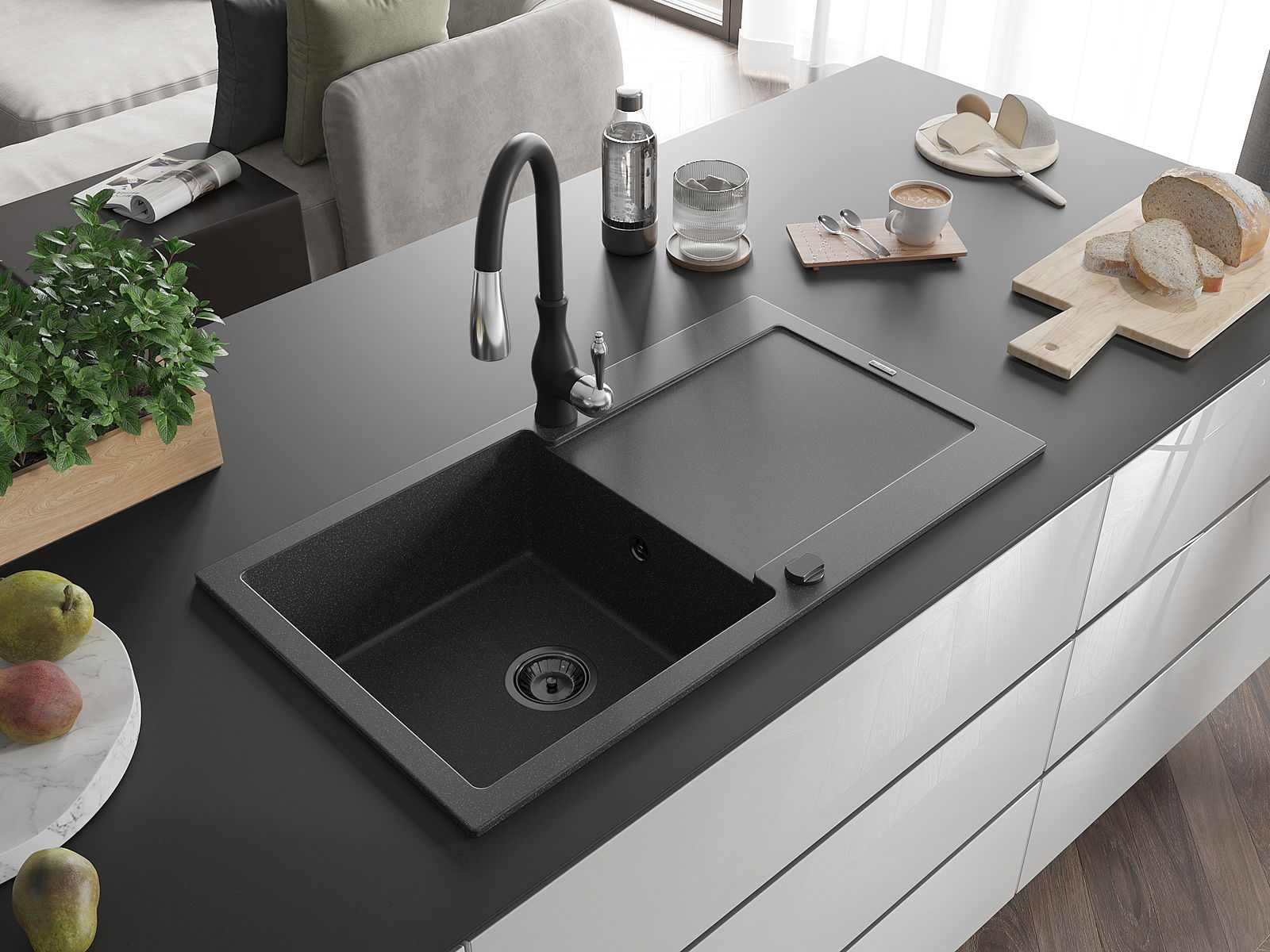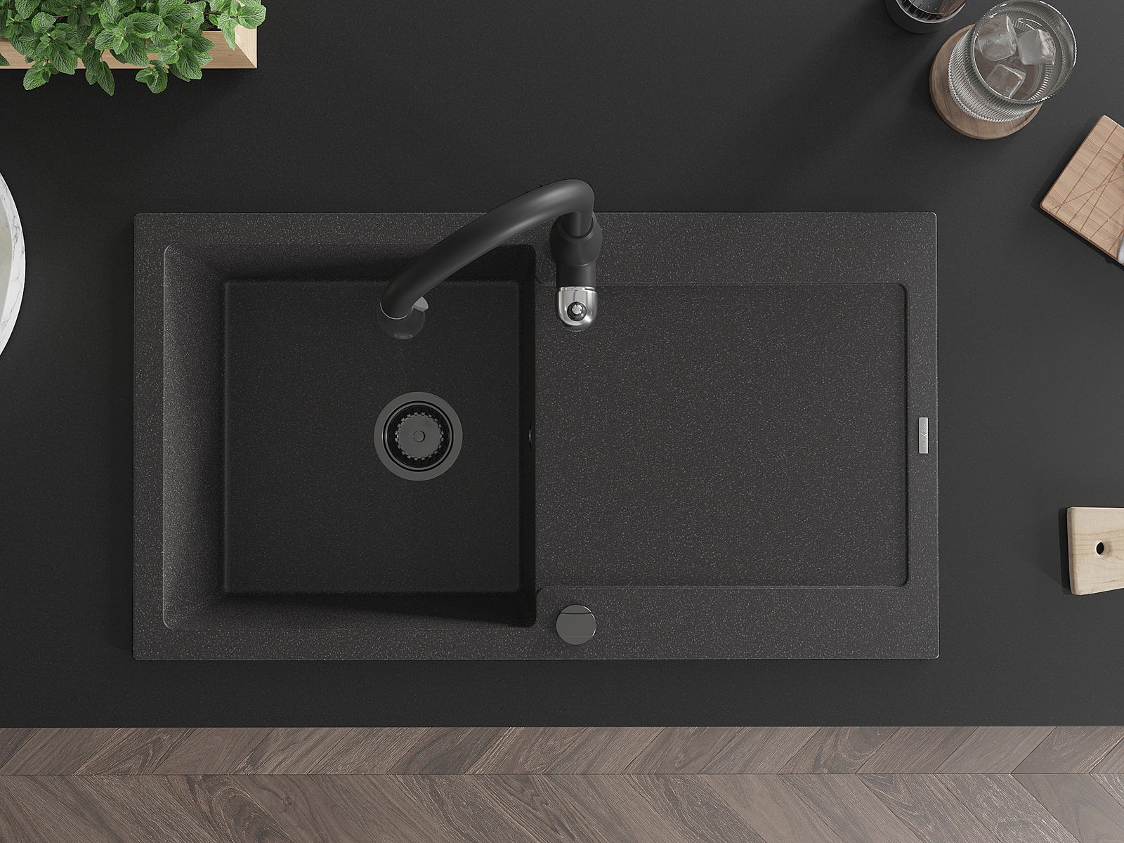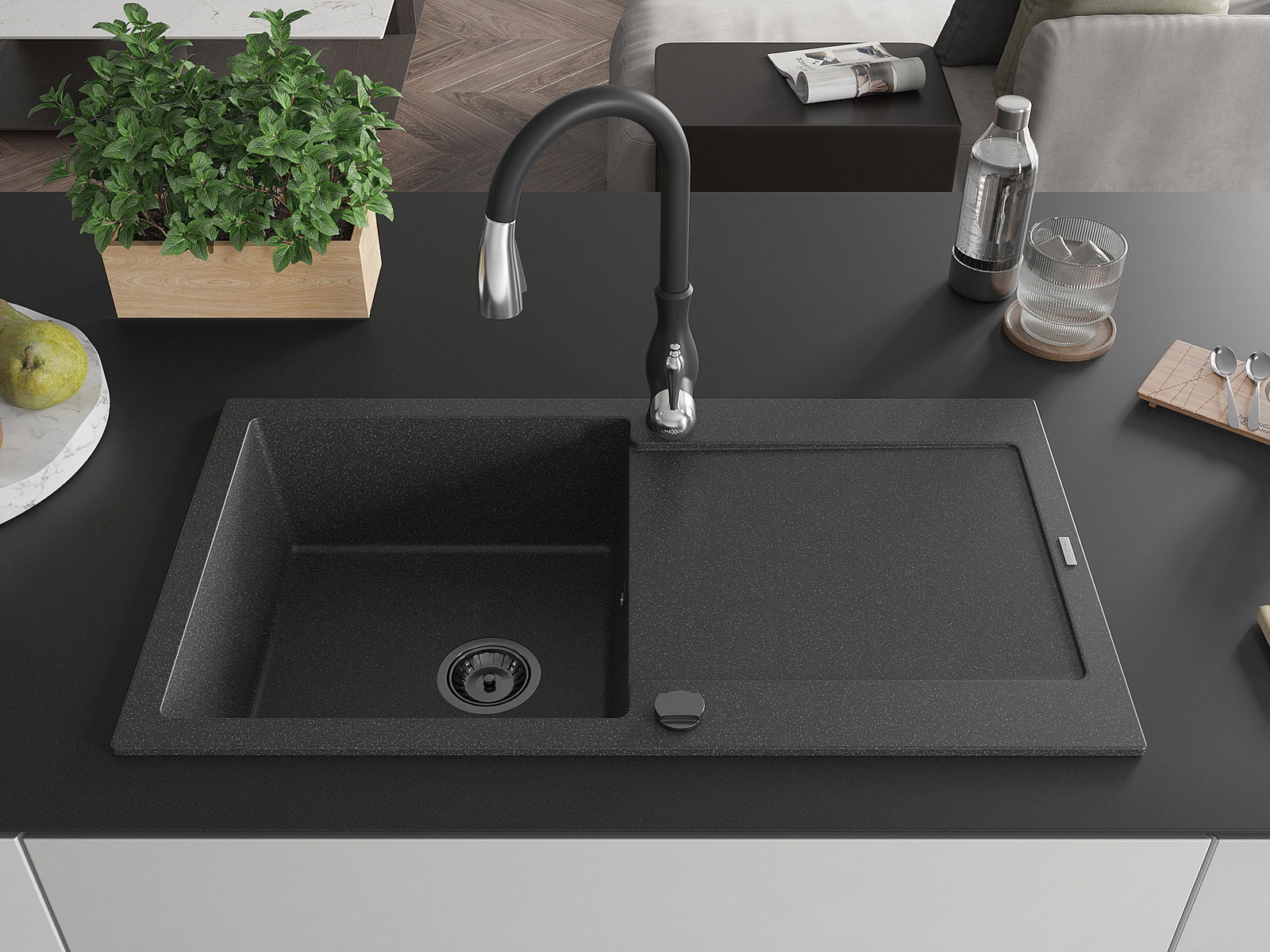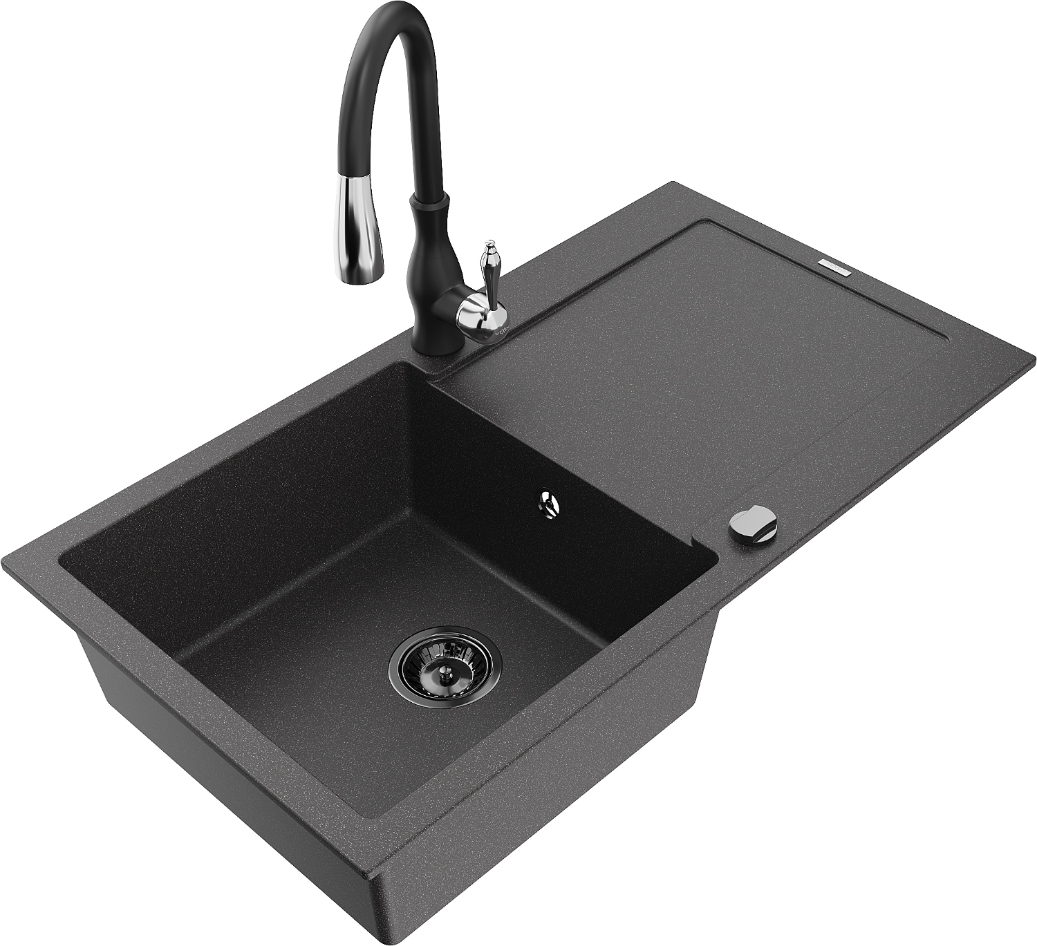 Mexen Leo granīta izlietne ar 1 kameru ar noteces zonu un virtuves jaucējkrānu Savita, melns ar krāsojumu - 6501-76-672601-70-B