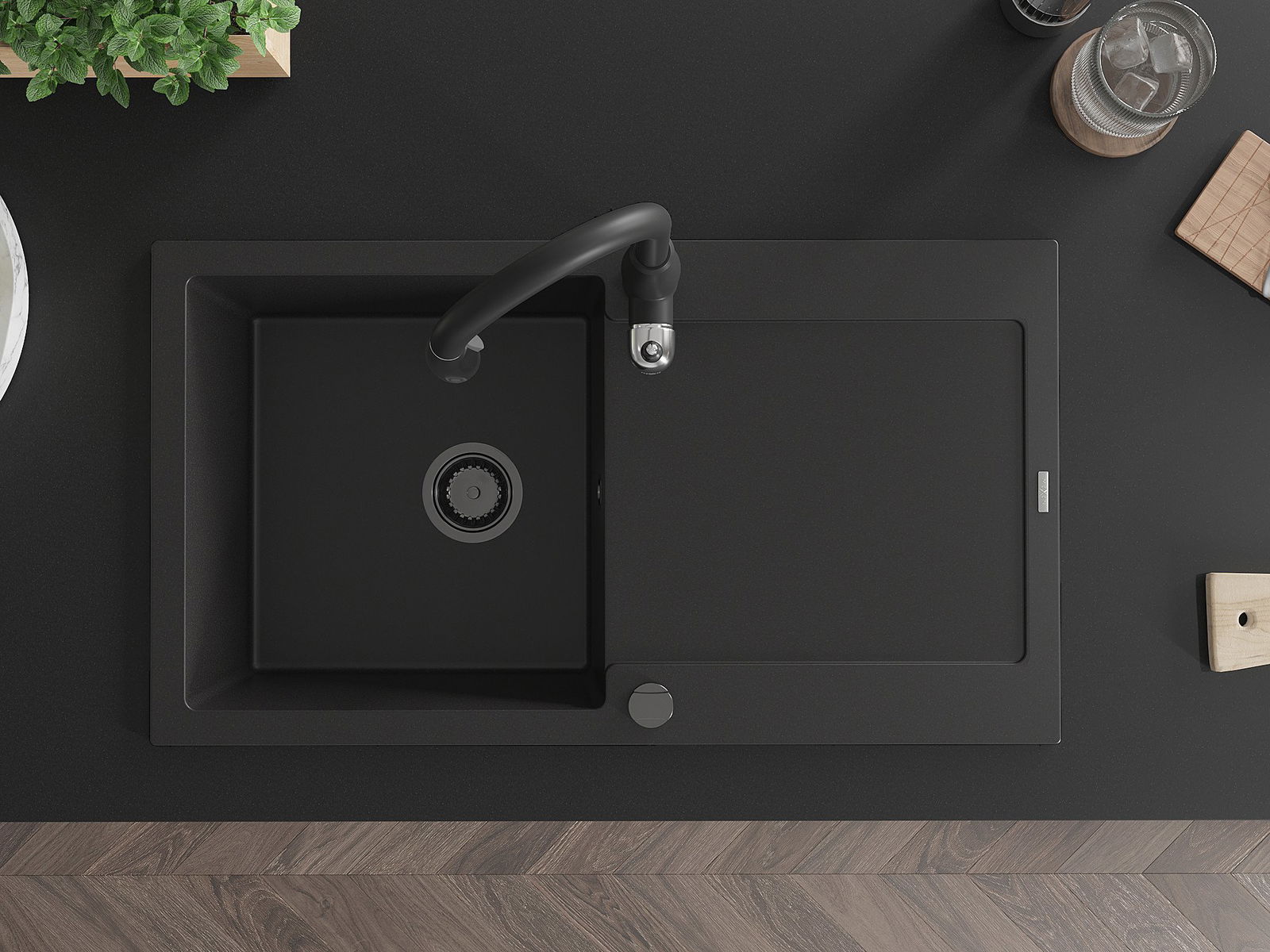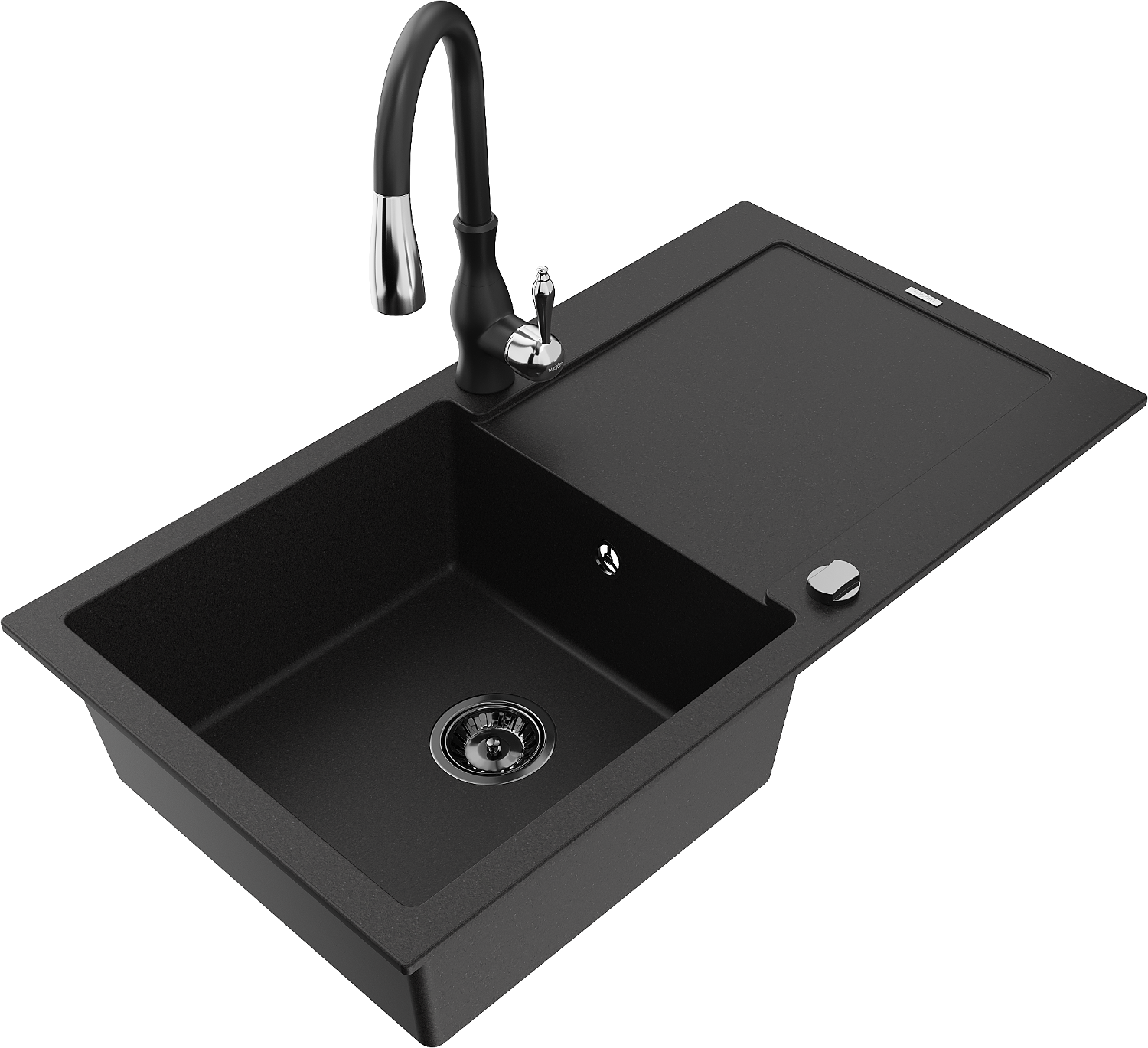 Mexen Leo granīta izlietne ar vienu nodalījumu, noteku un virtuves jaucējkrānu Savita, melna - 6501-77-672601-70-B