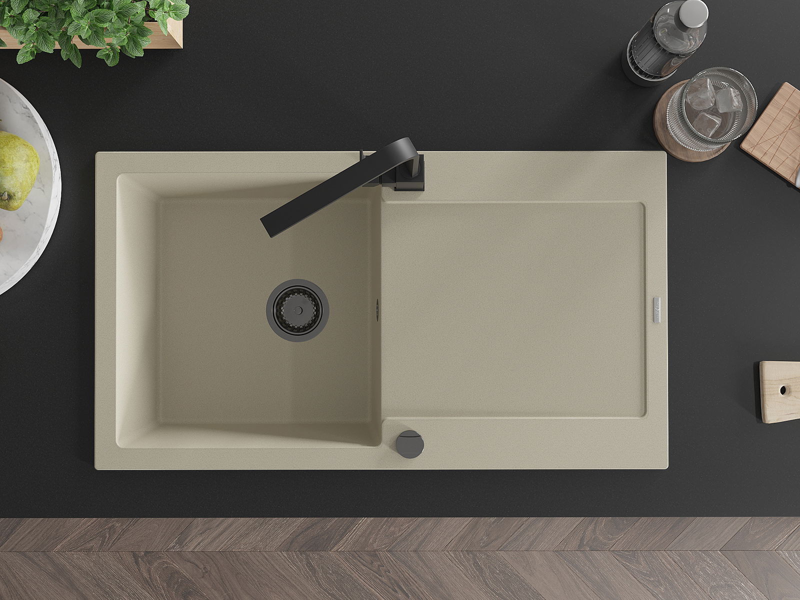 Mexen Leo granitā izlietne ar vienu nodalījumu, notekpaplāti un virtuves jaucējkrānu Rita, bēša - 6501-69-670300-70
