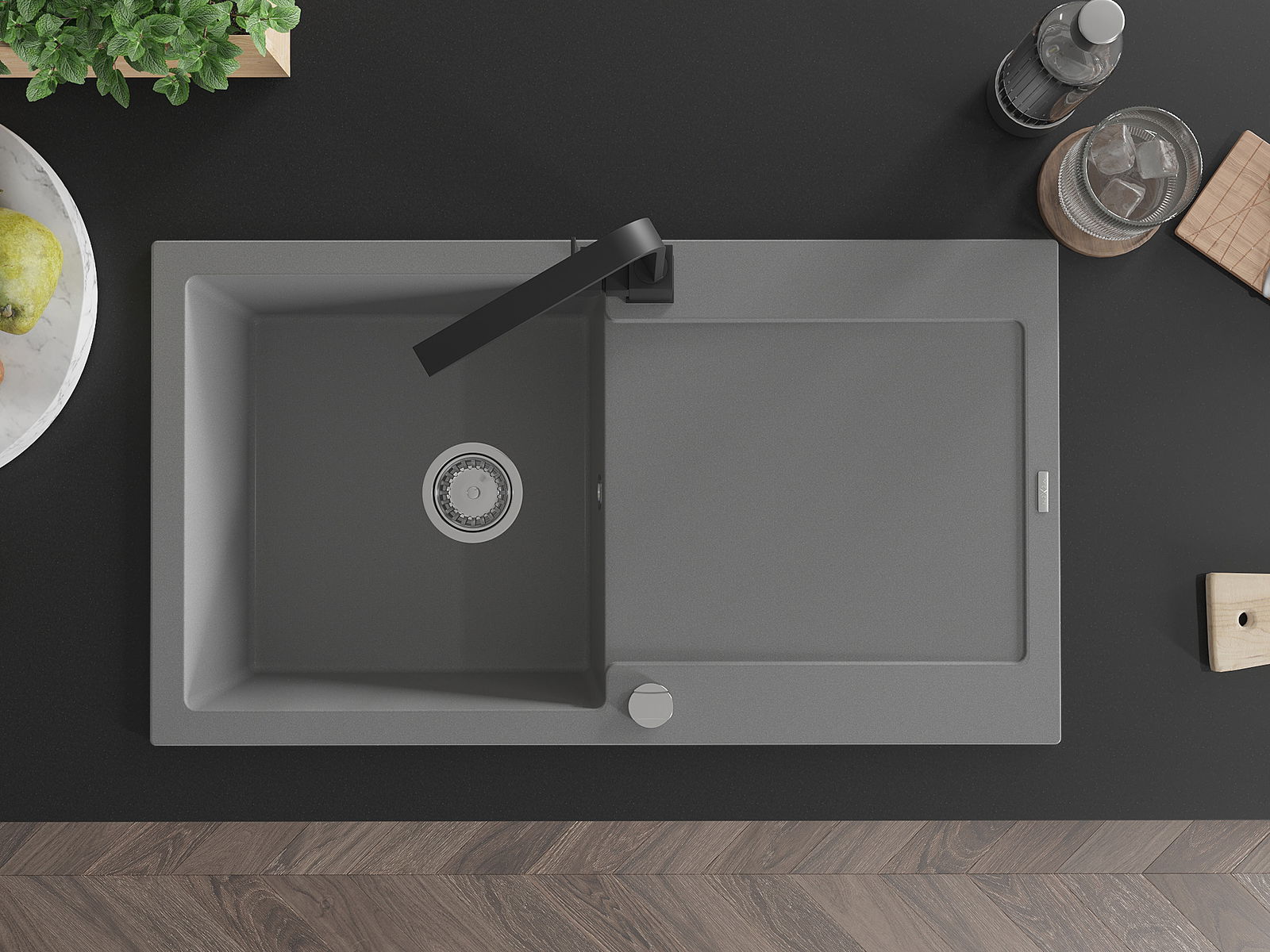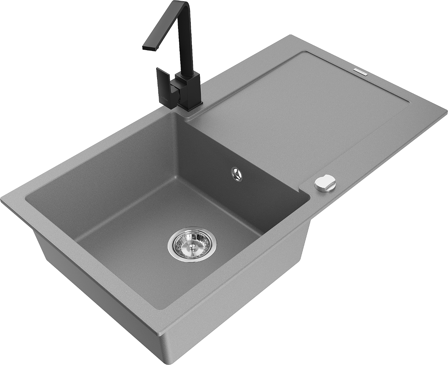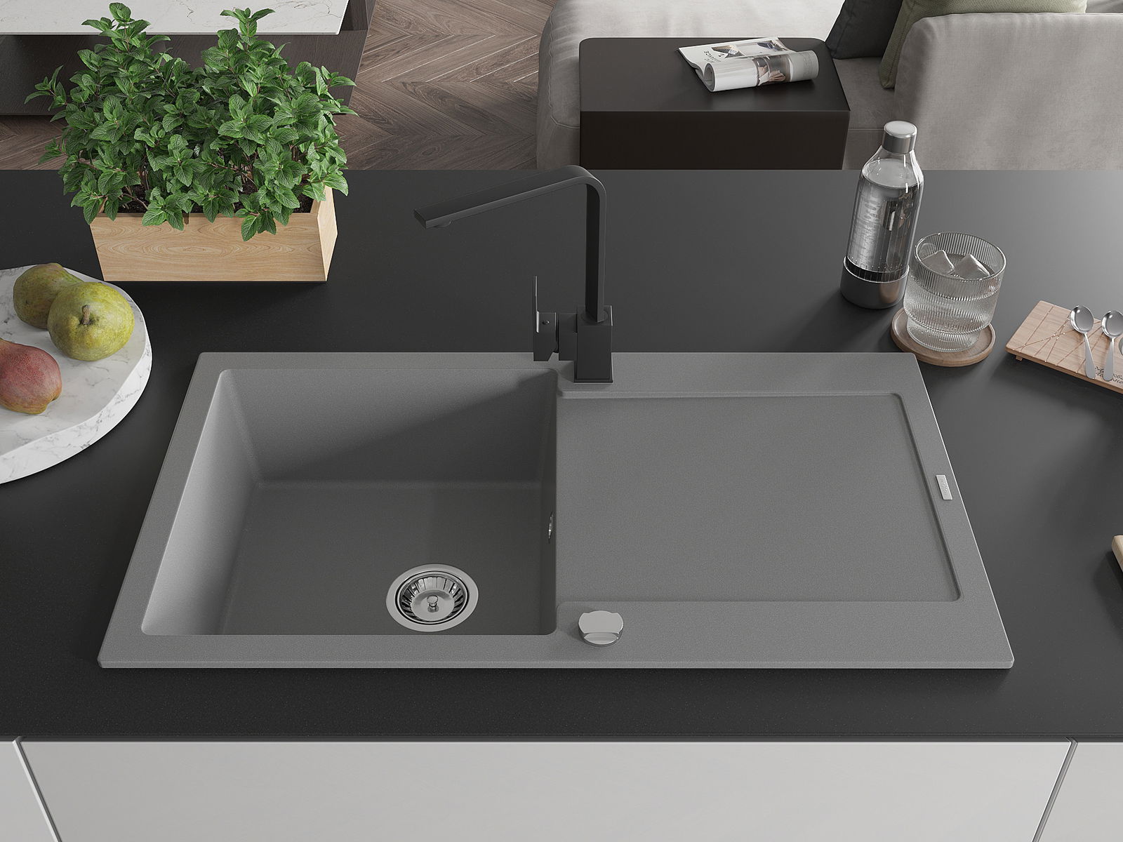 Mexen Leo granitā izlietne ar vienu nodalījumu un noteces paneli un virtuvju jaucējkrānu Rita, pelēka - 6501-71-670300-70