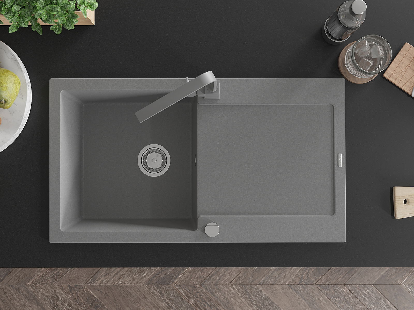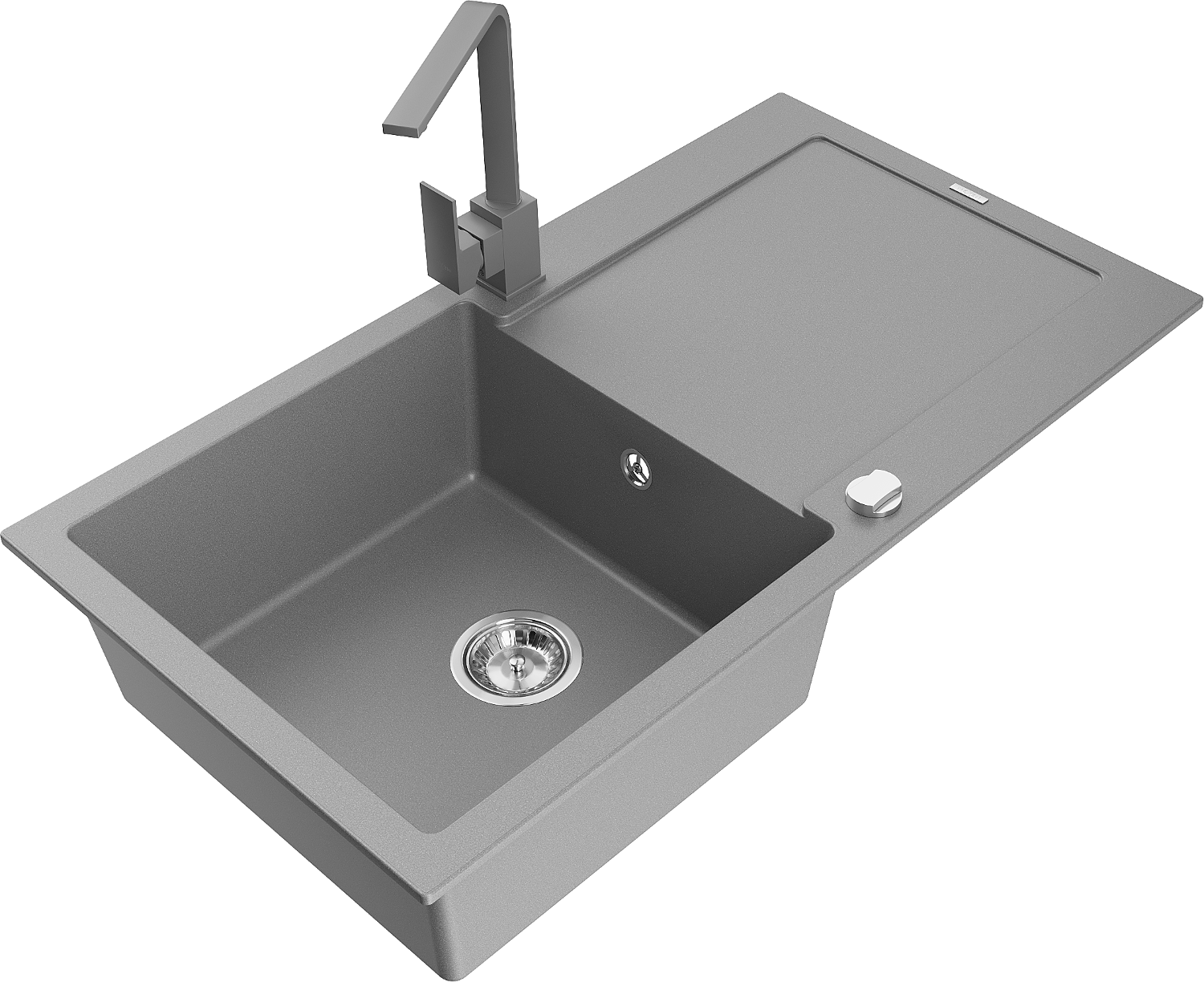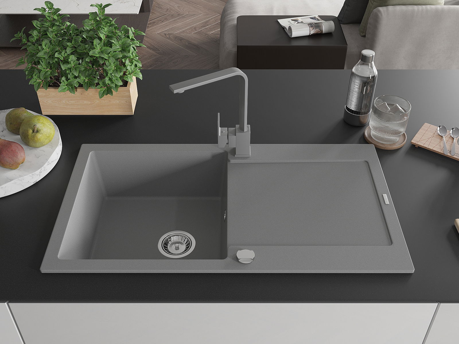 Mexen Leo granit izlietne ar vienu nodalījumu un ūdens noteci un Rita virtuves jaucējkrānu, pelēks - 6501-71-670300-71