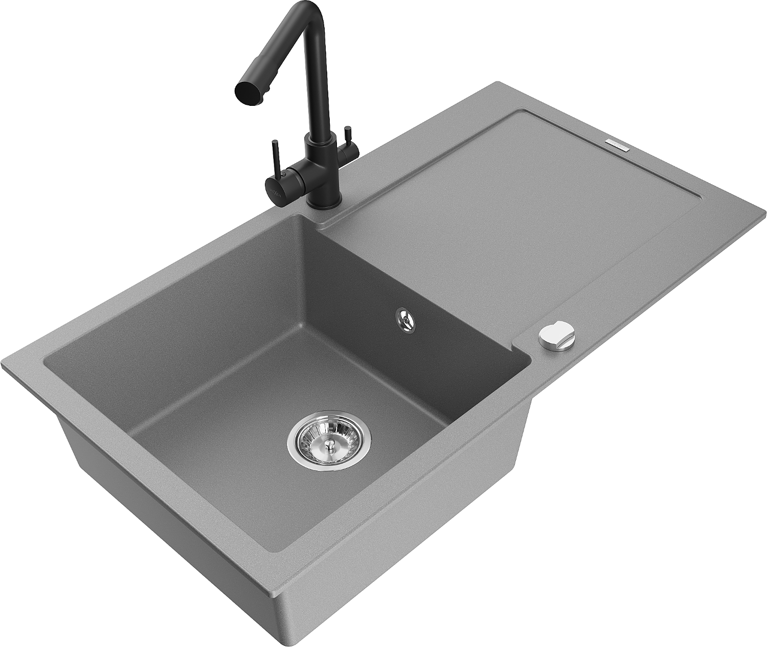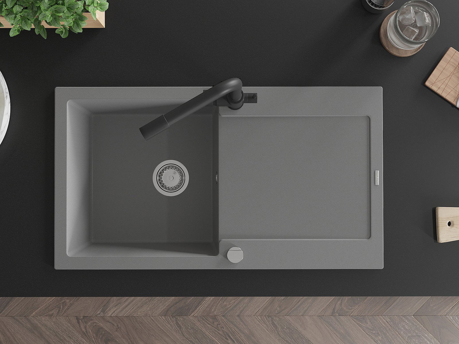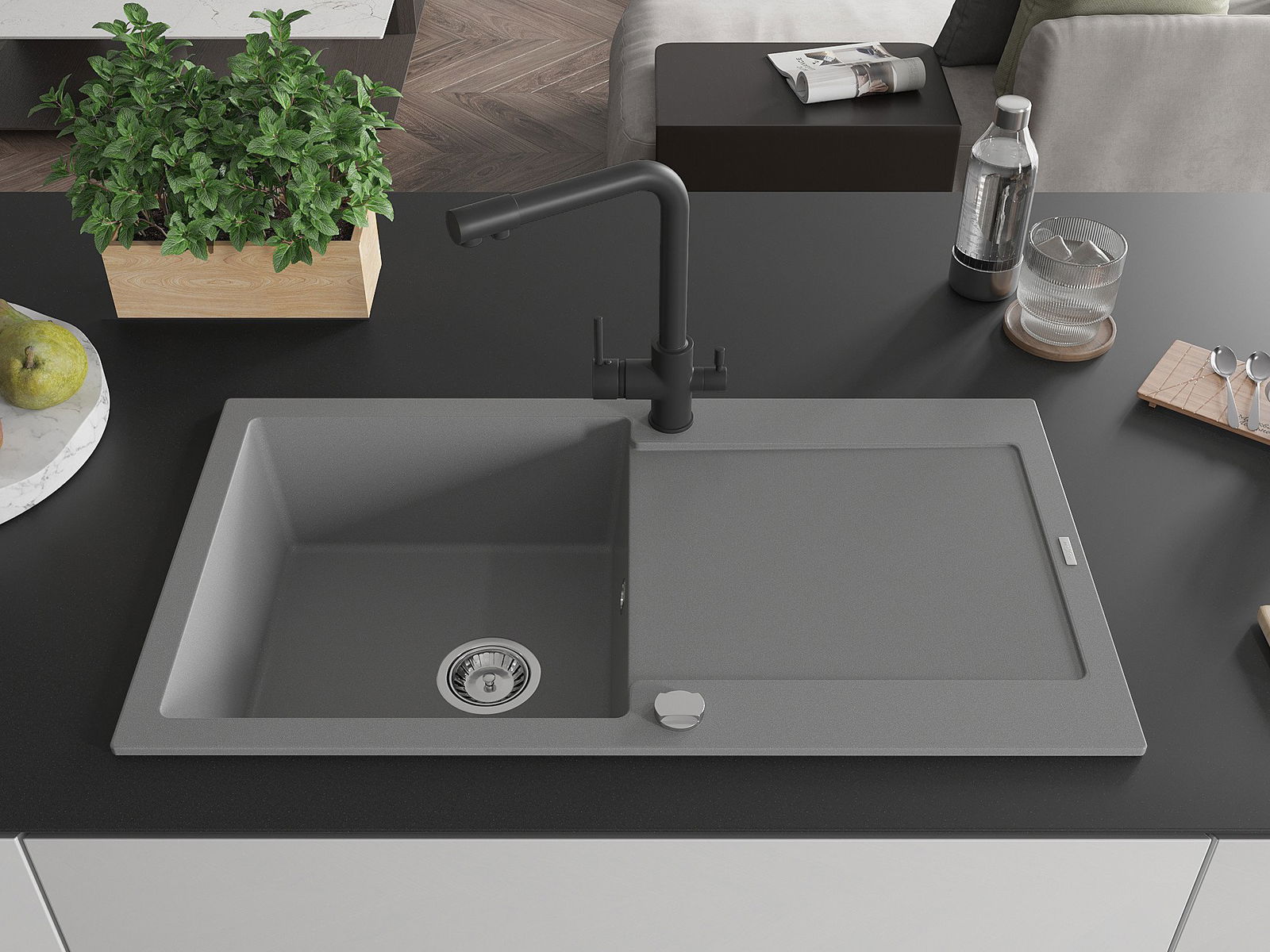 Mexen Leo granīta izlietne ar vienu nodalījumu un noteku, virtuves krānu Duero, pelēka - 6501-71-671600-70