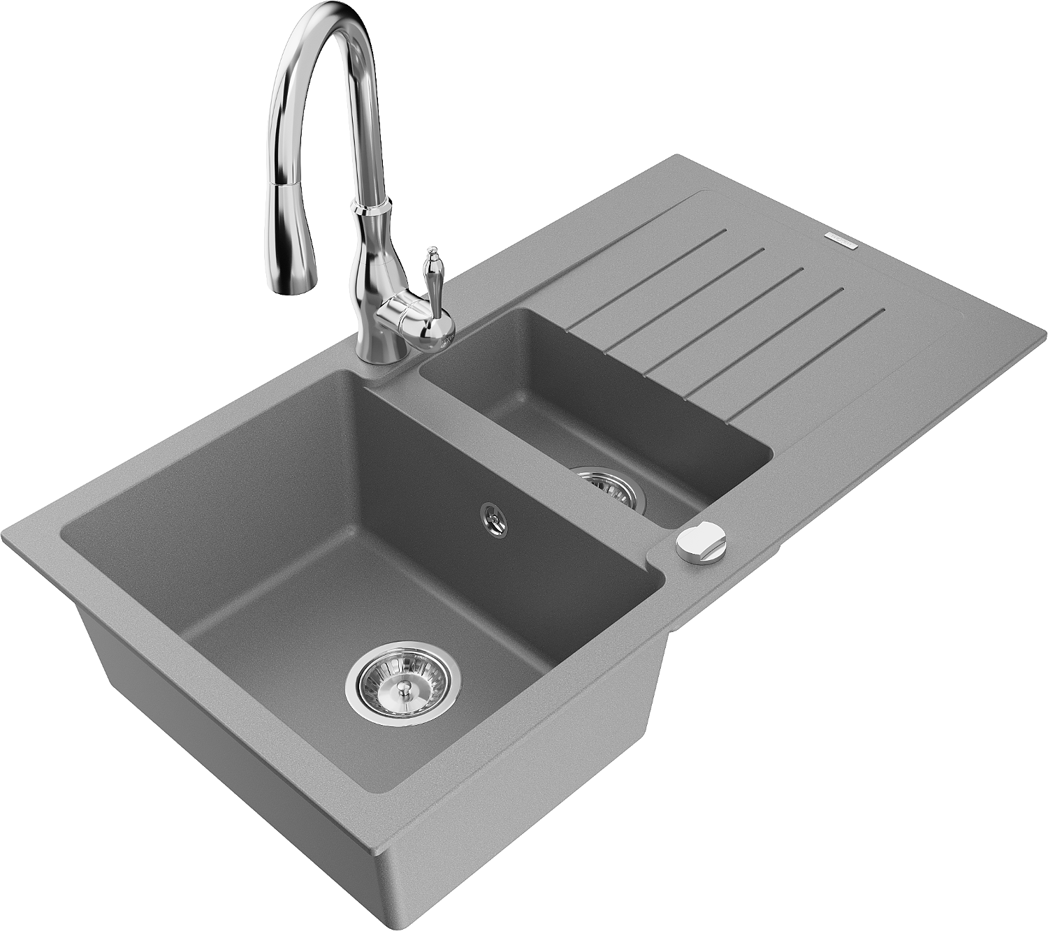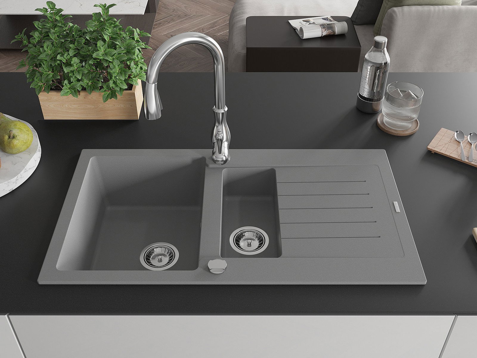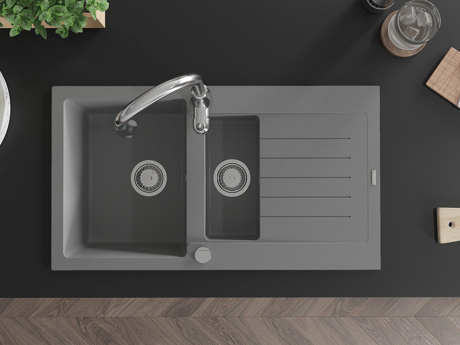 Mexen Matias granitizlietne ar 1,5 nodalījumiem, notecējumu un virtuves jaucējkrānu Savita, pelēks - 6502-71-672601-00