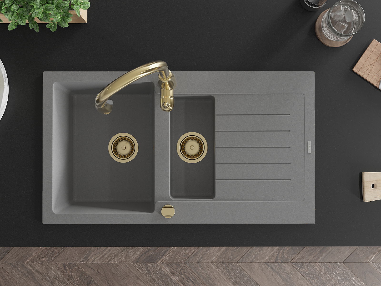 Mexen Matias granīta izlietne ar 1,5 nodalījumiem, iztekas nodalījumu un virtuves krānu Savita, pelēka - 6502-71-672601-50