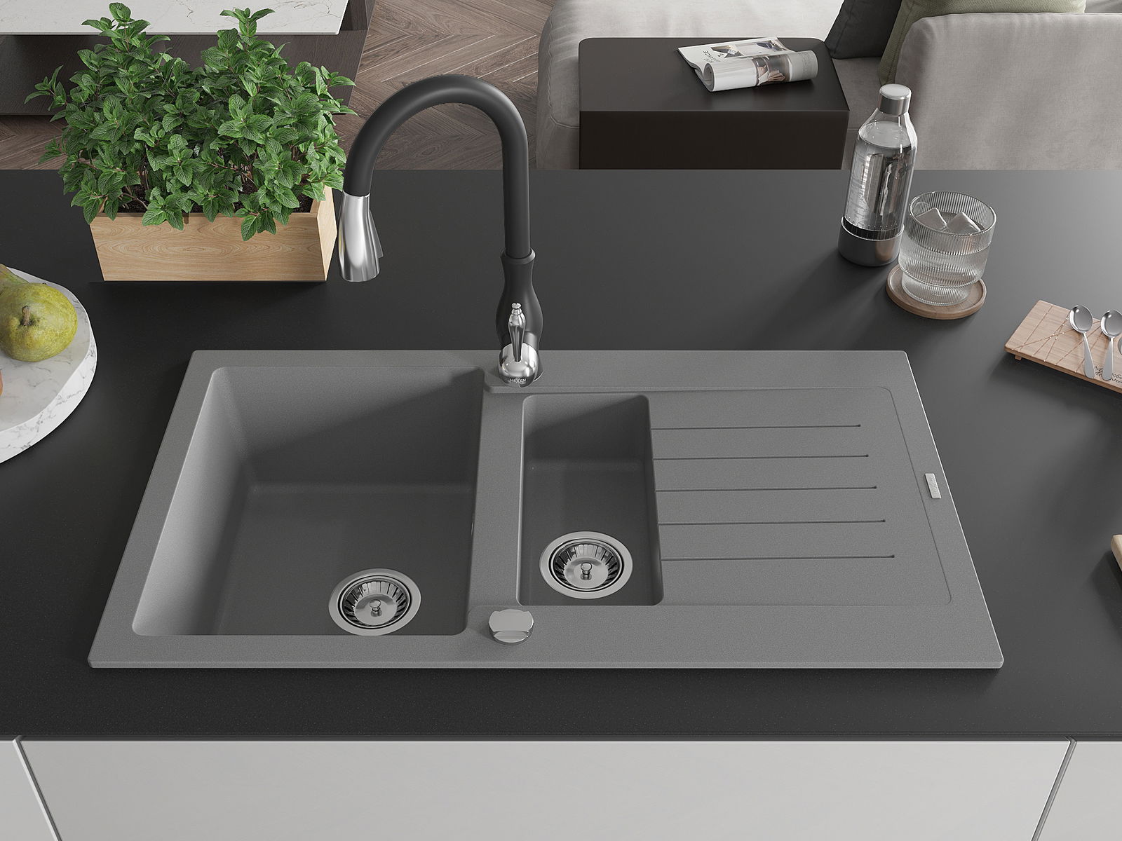 Mexen Matias granīta izlietne ar 1,5 nodalījumu, ar noteci un virtuves jaucējkrānu Savita, pelēks - 6502-71-672601-70