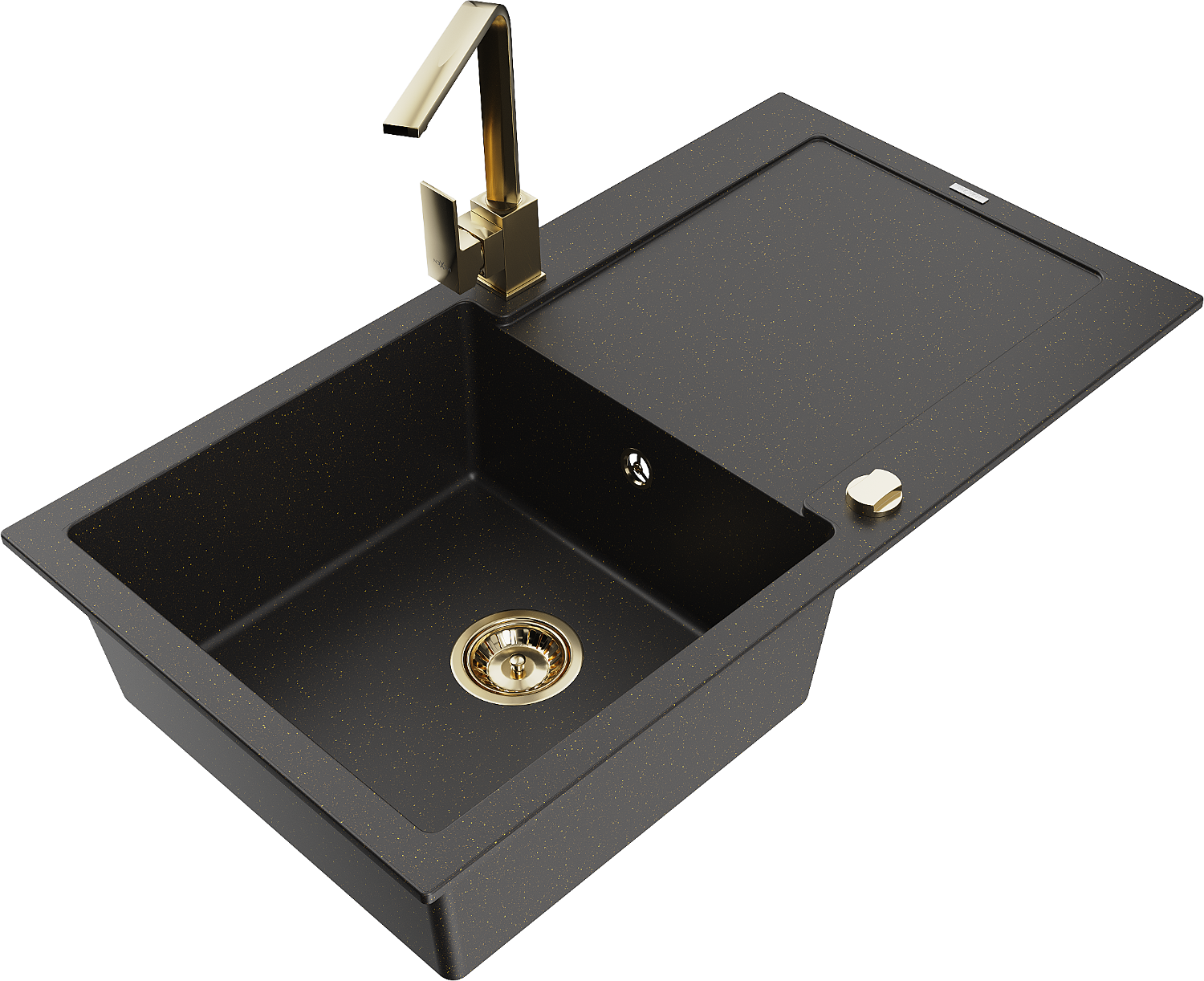 Mexen Leo granitais izlietne ar vienu nodalījumu, notekvietu un virtuves jaucējkrānu Rita, melns/zelta metālisks