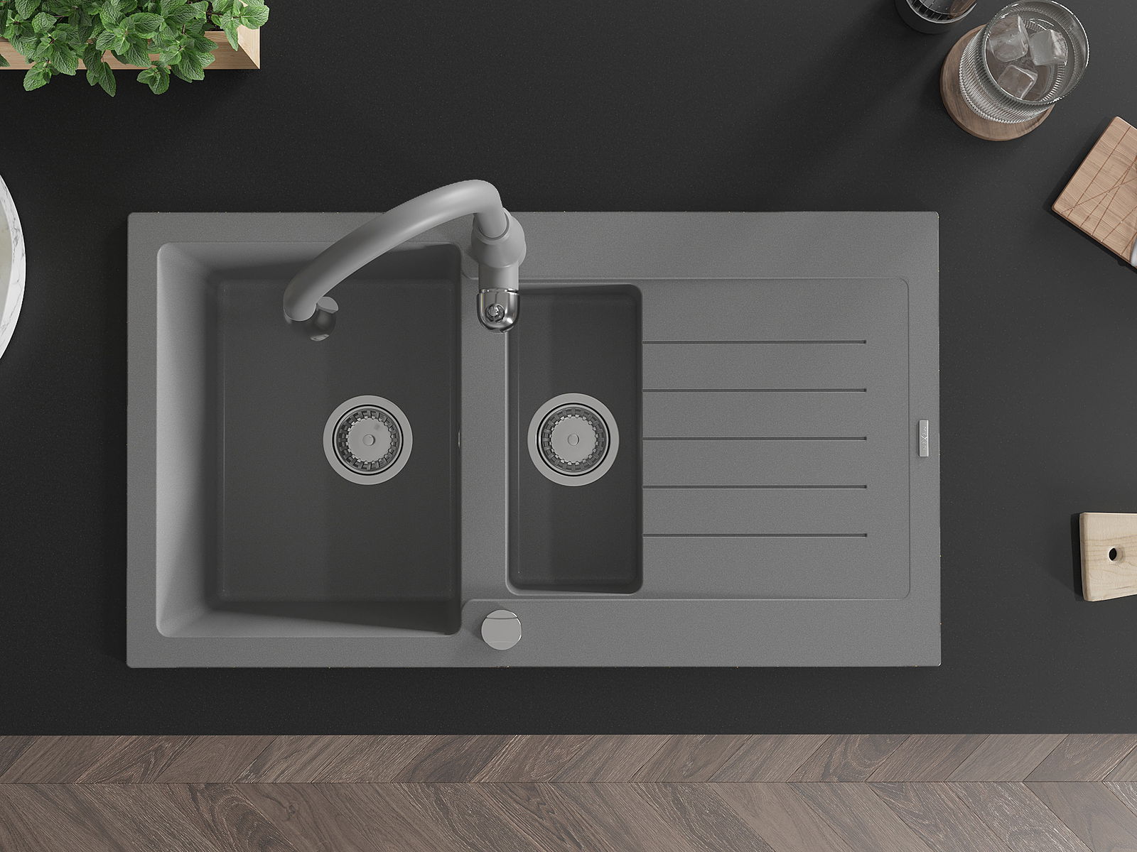 Mexen Matias granīta izlietne ar 1,5 nodalījumiem un nosūcēju un virtuves jaucējkrānu Savita, pelēks - 6502-71-672601-71