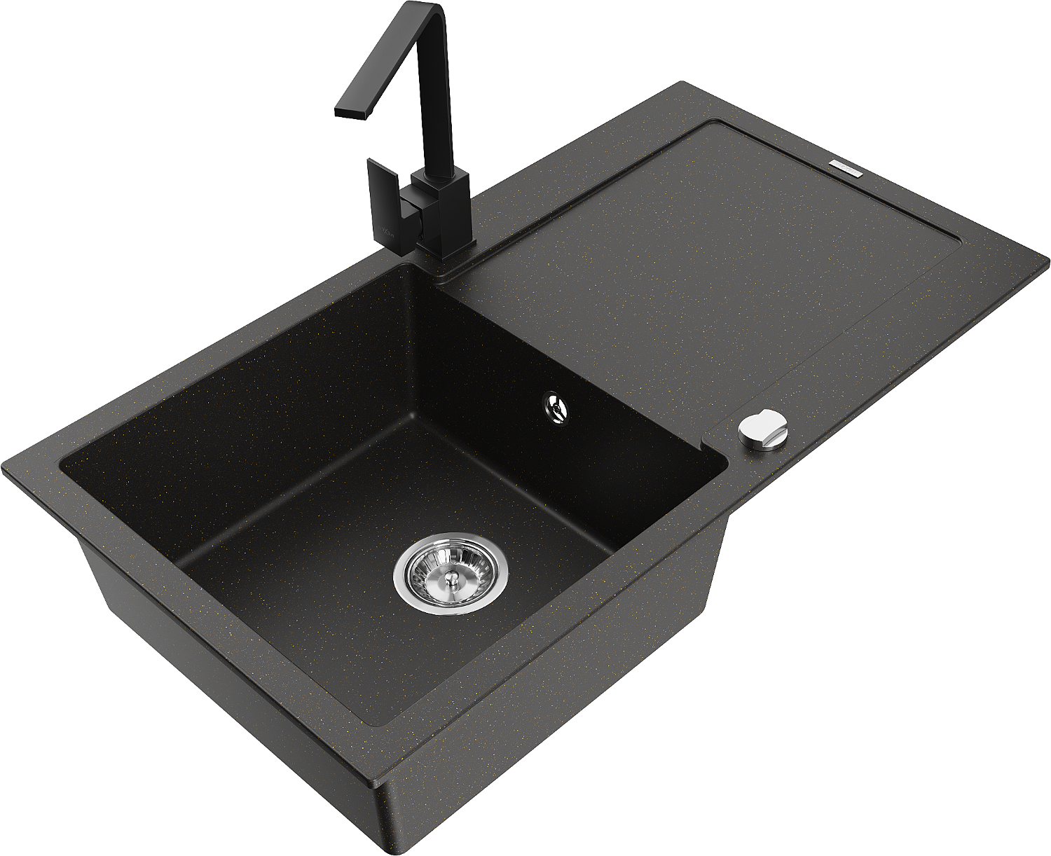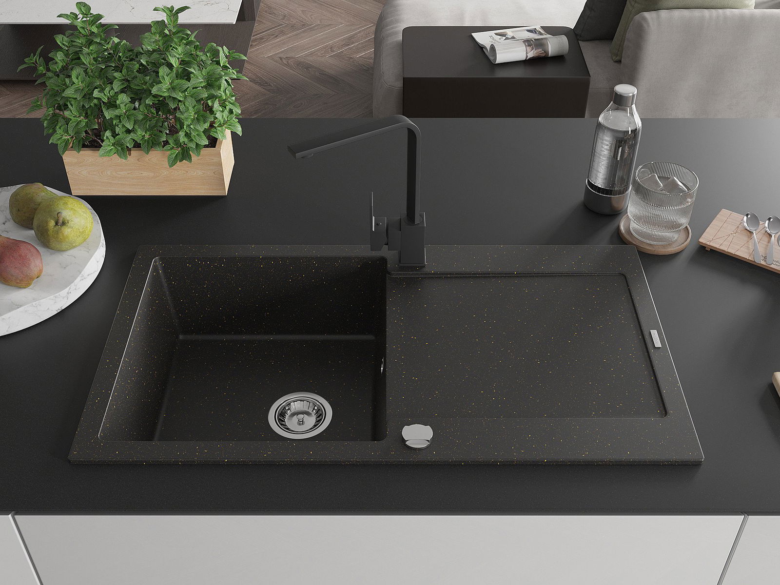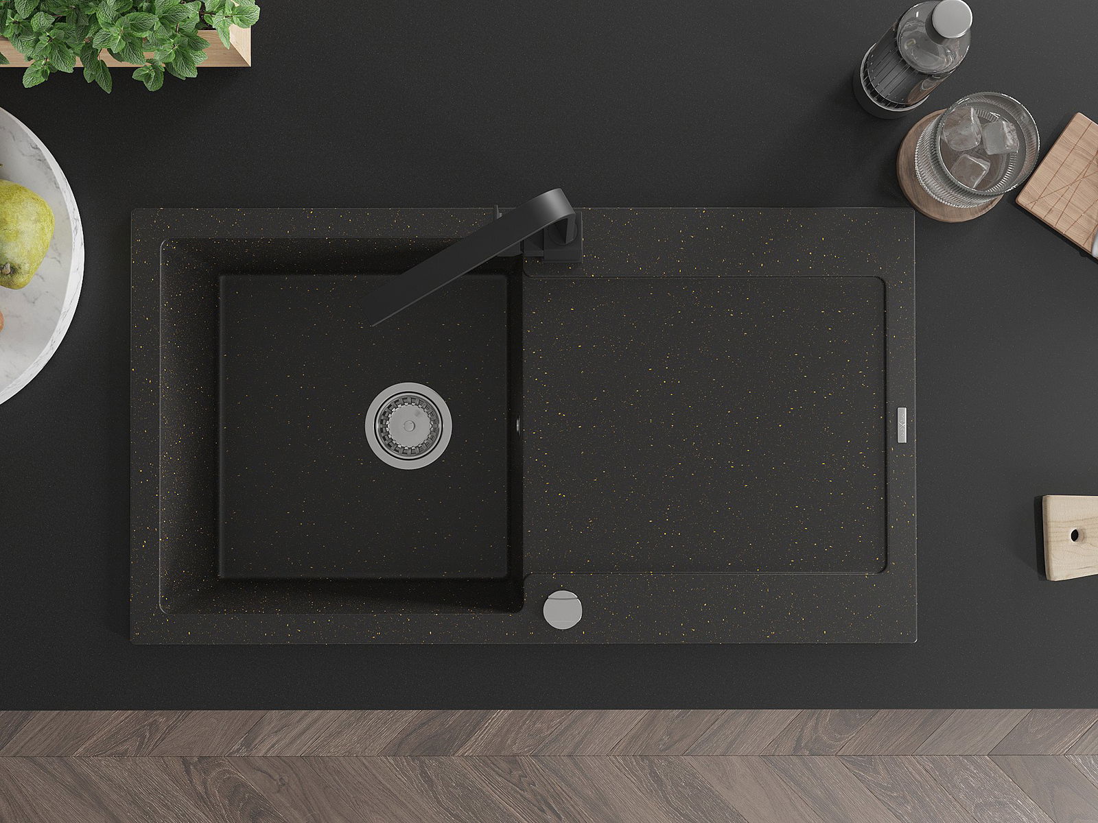 Mexen Leo granitizlietne ar vienu nodalījumu, noteces vietu un virtuves krānu Rita, melna/zeltita metālika