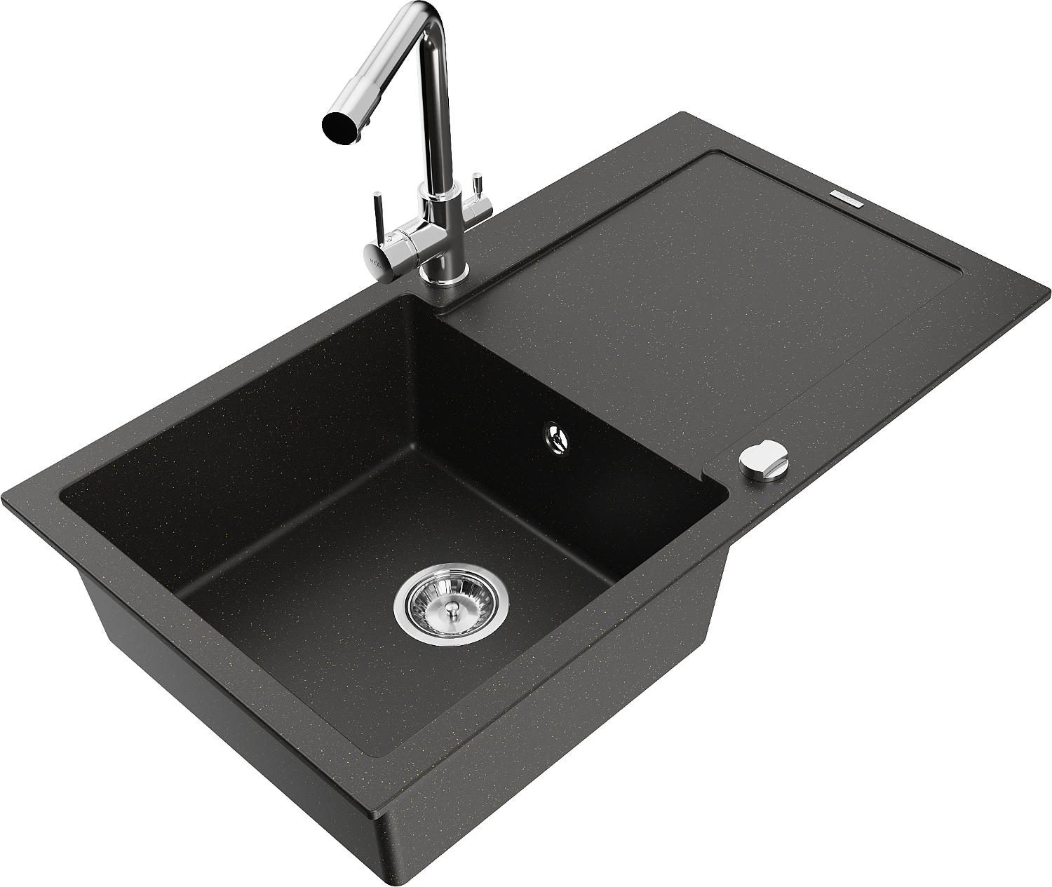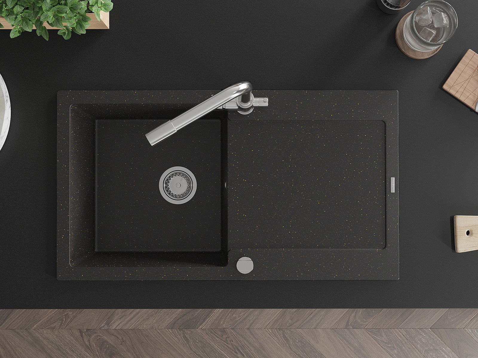 Mexen Leo granitizlietne ar vienu nodalījumu ar noteku un virtuves jaucējkrānu Duero, melns/zeltītas krāsas metālisks