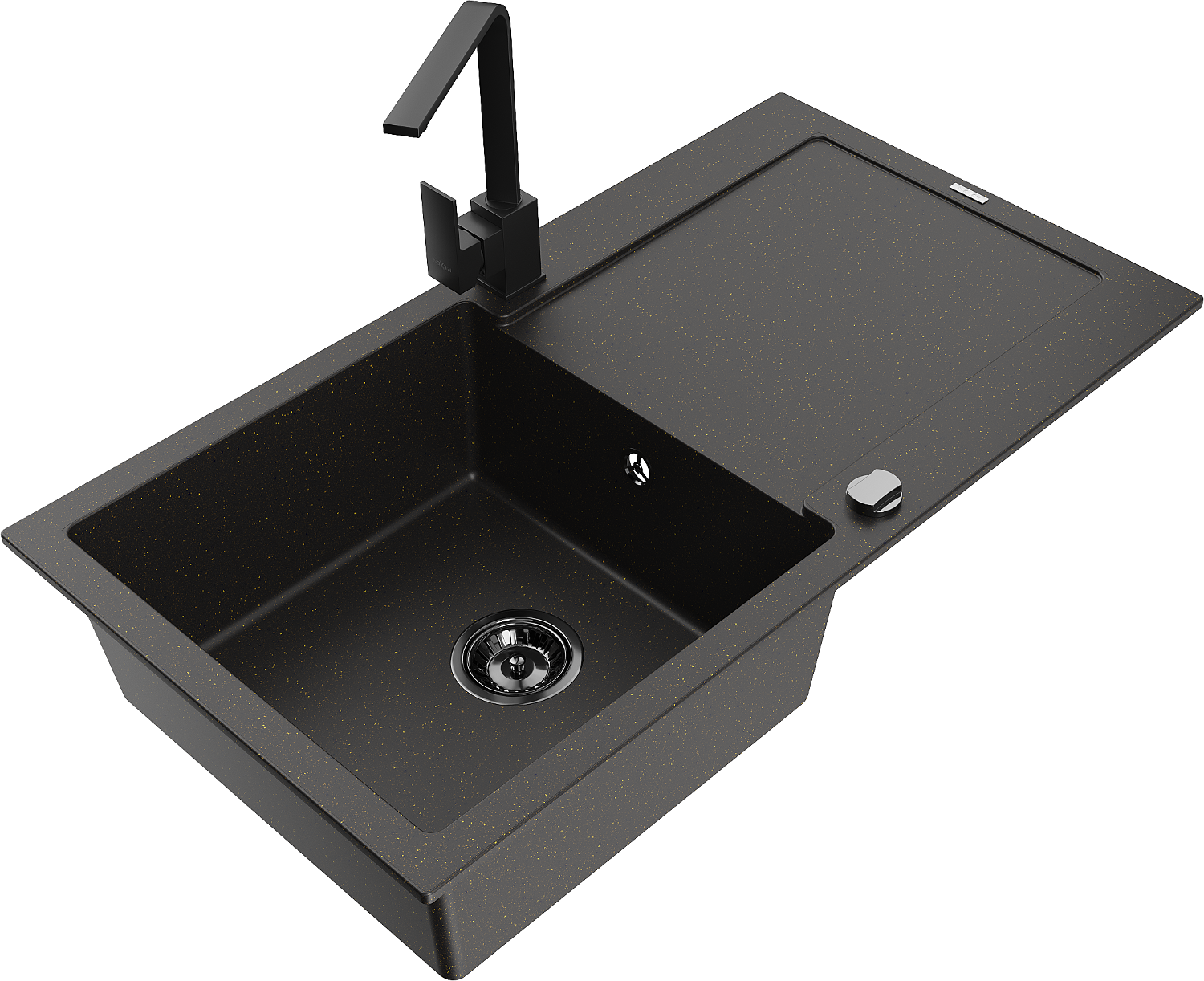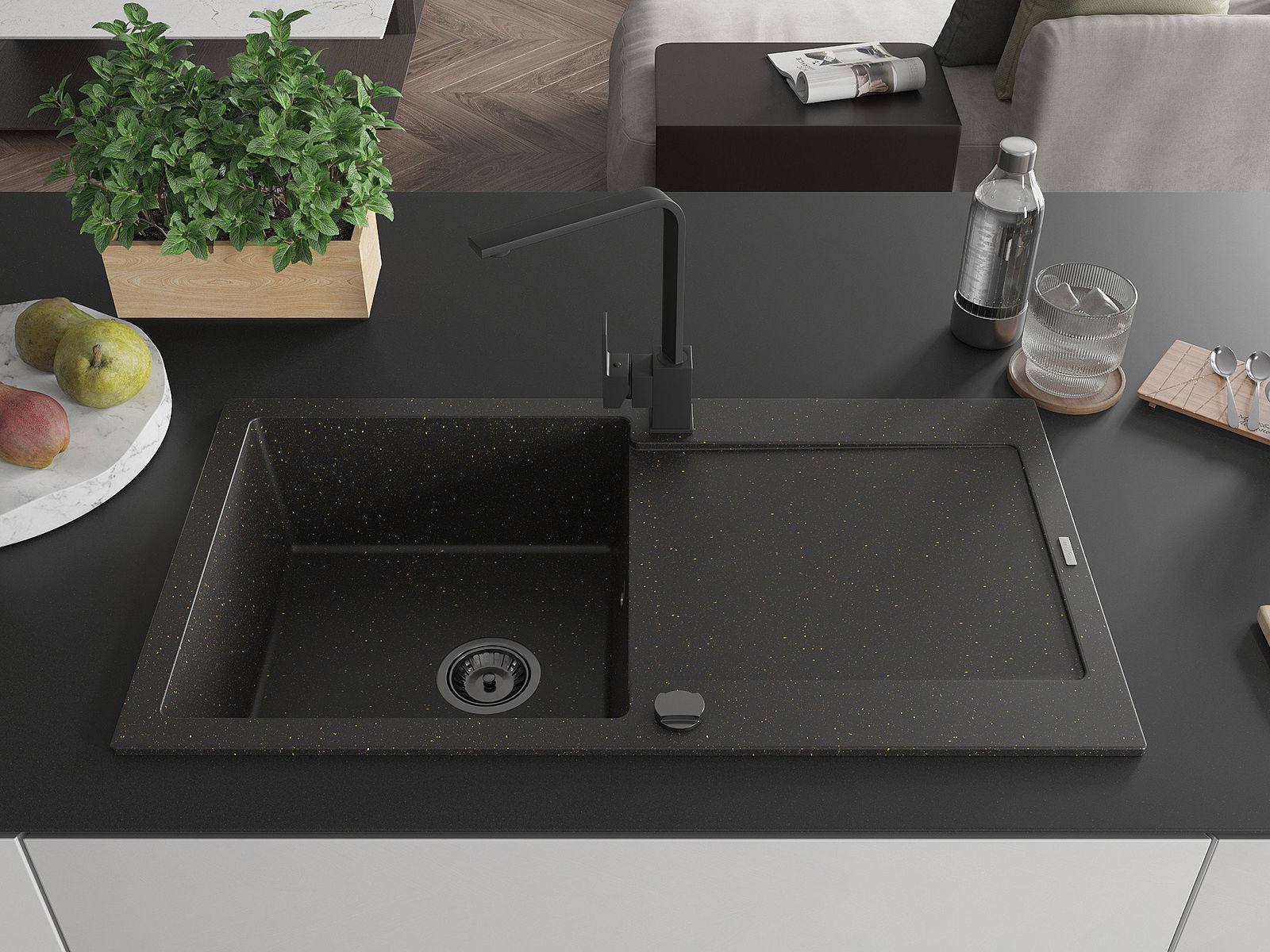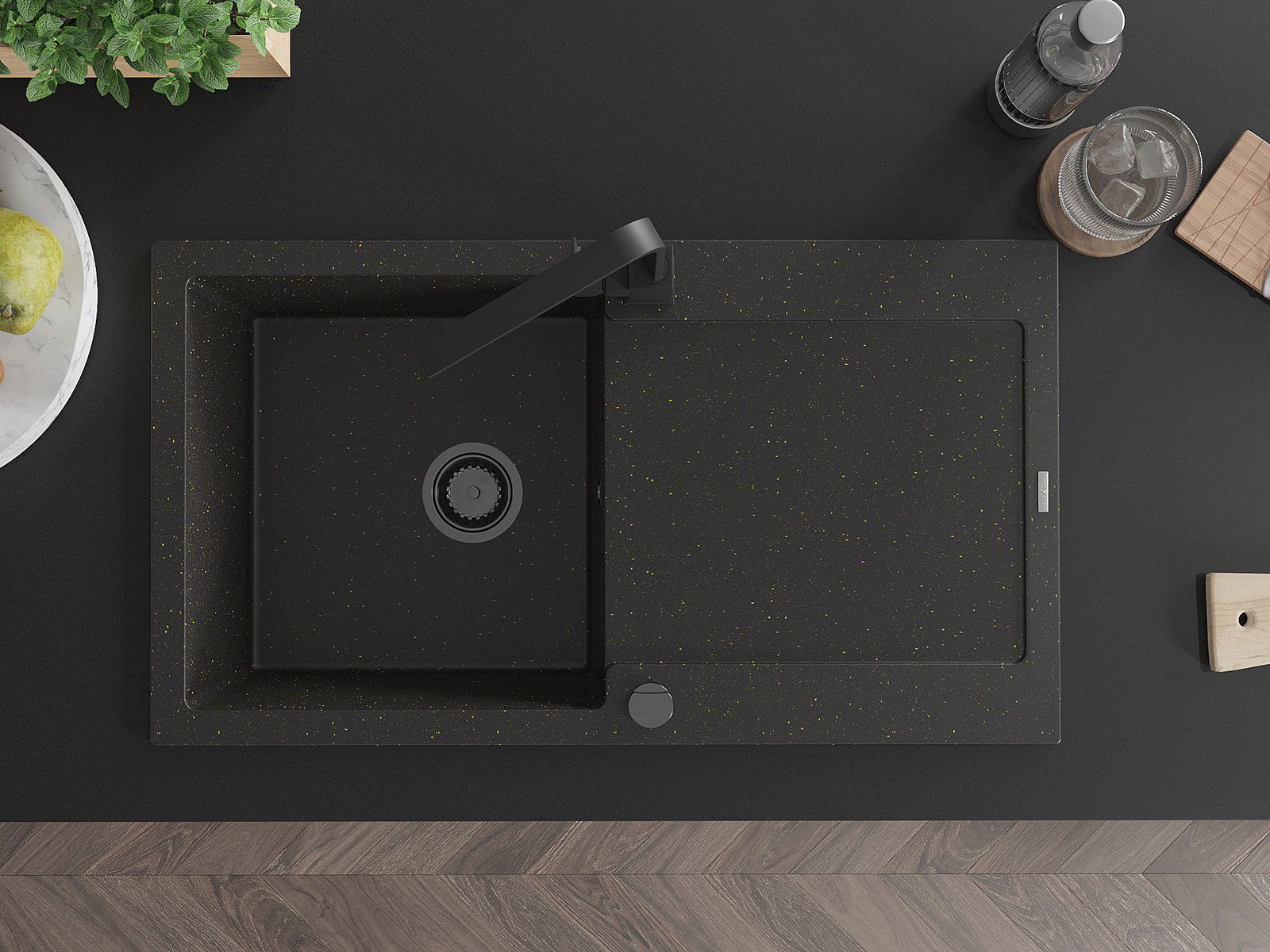 Mexen Leo granitizlietne ar vienu nodalījumu, ar notekas zonu un virtuves jaucējkrānu Rita, melna/zeltīta metālika