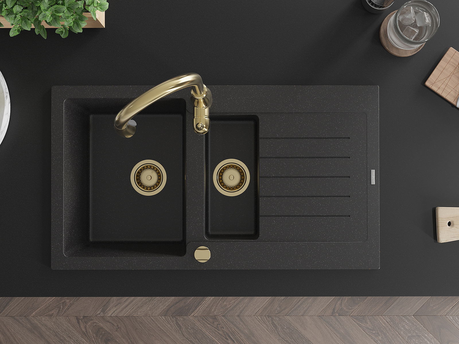 Izlietnei ir 2 daļēji izurbtas atveres ar diametru 35 mm, kuras var pašrocīgi izsist. Tās var izmantot, piemēram, šķidruma dozatora uzstādīšanai, kas novērsīs plastmasas pudeļu klātbūtni virtuvē un piešķirs tai elegantu apdari.