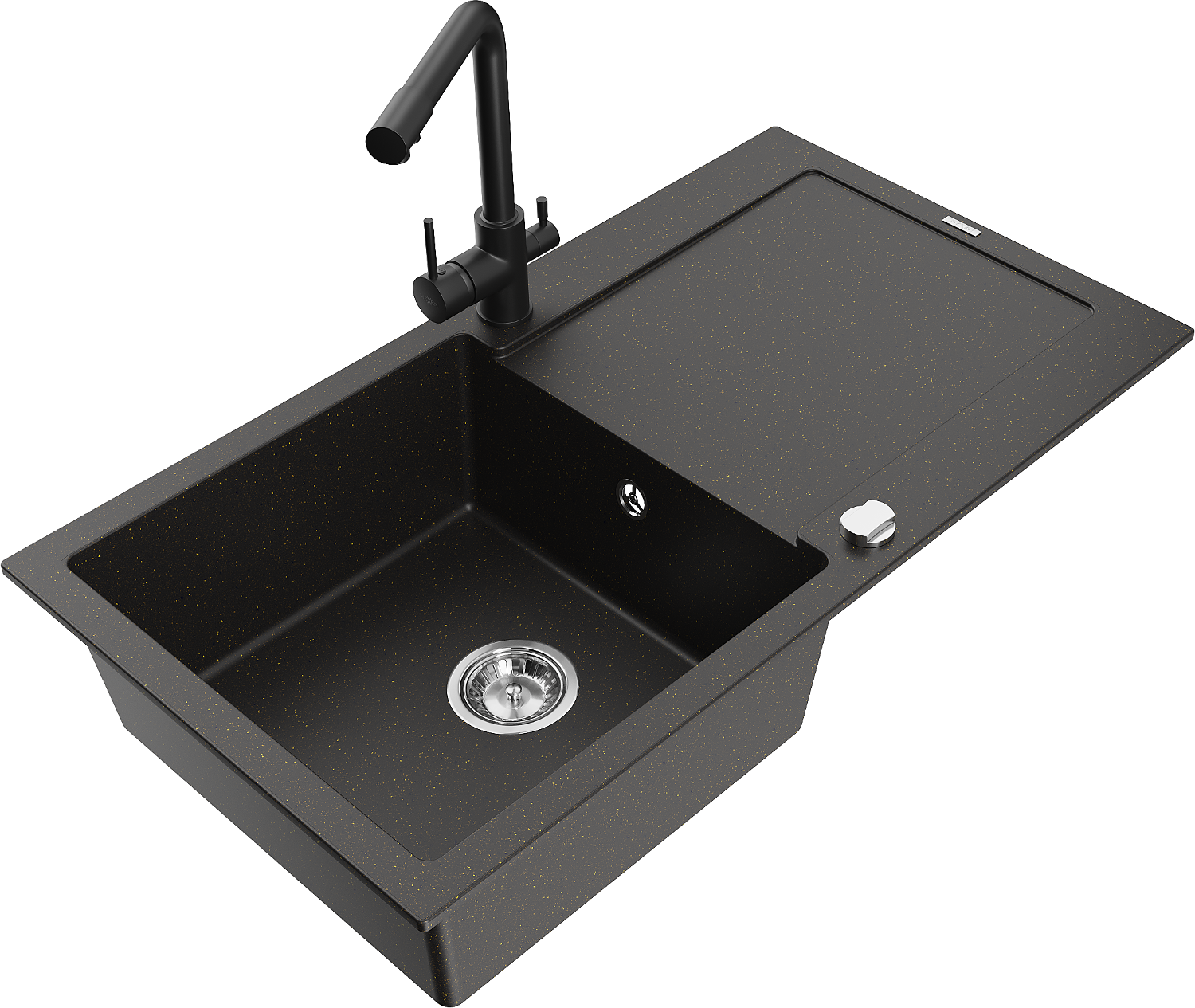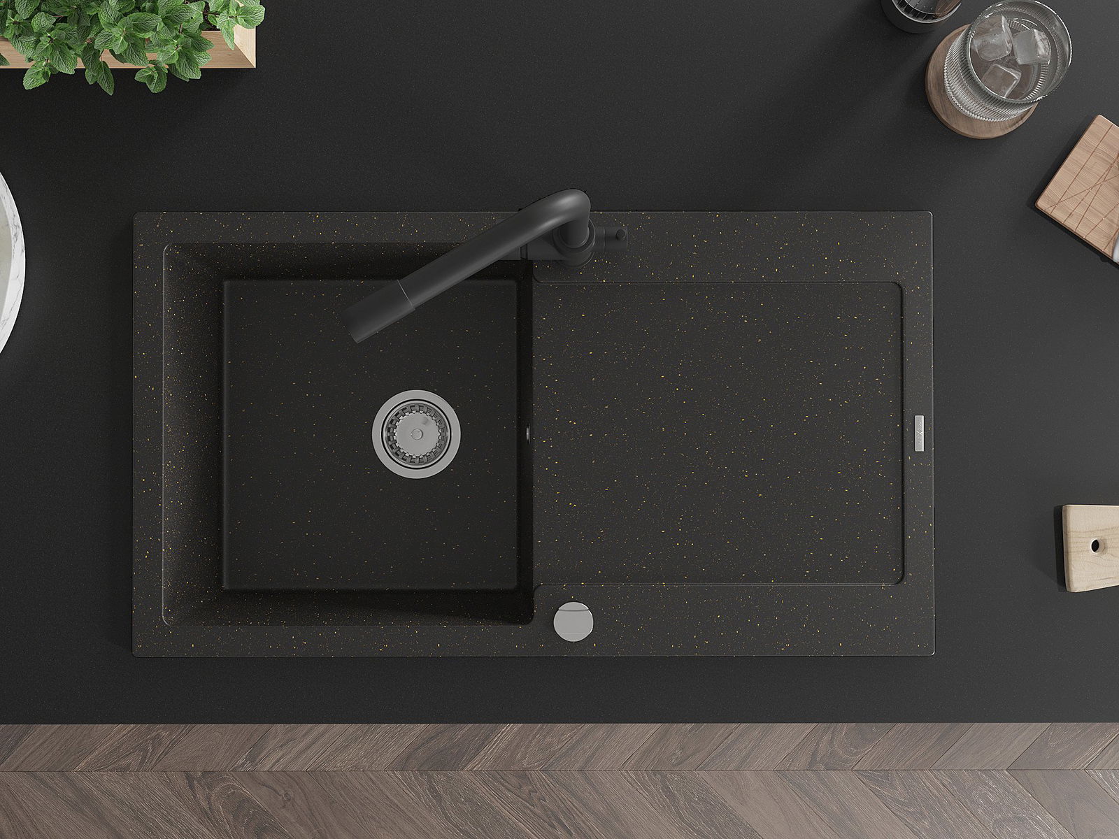 Mexen Leo granitais izlietne ar vienu nodalījumu, ar pilinātāju un virtuves jaucējkrānu Duero, melna/zeltīta metāliska