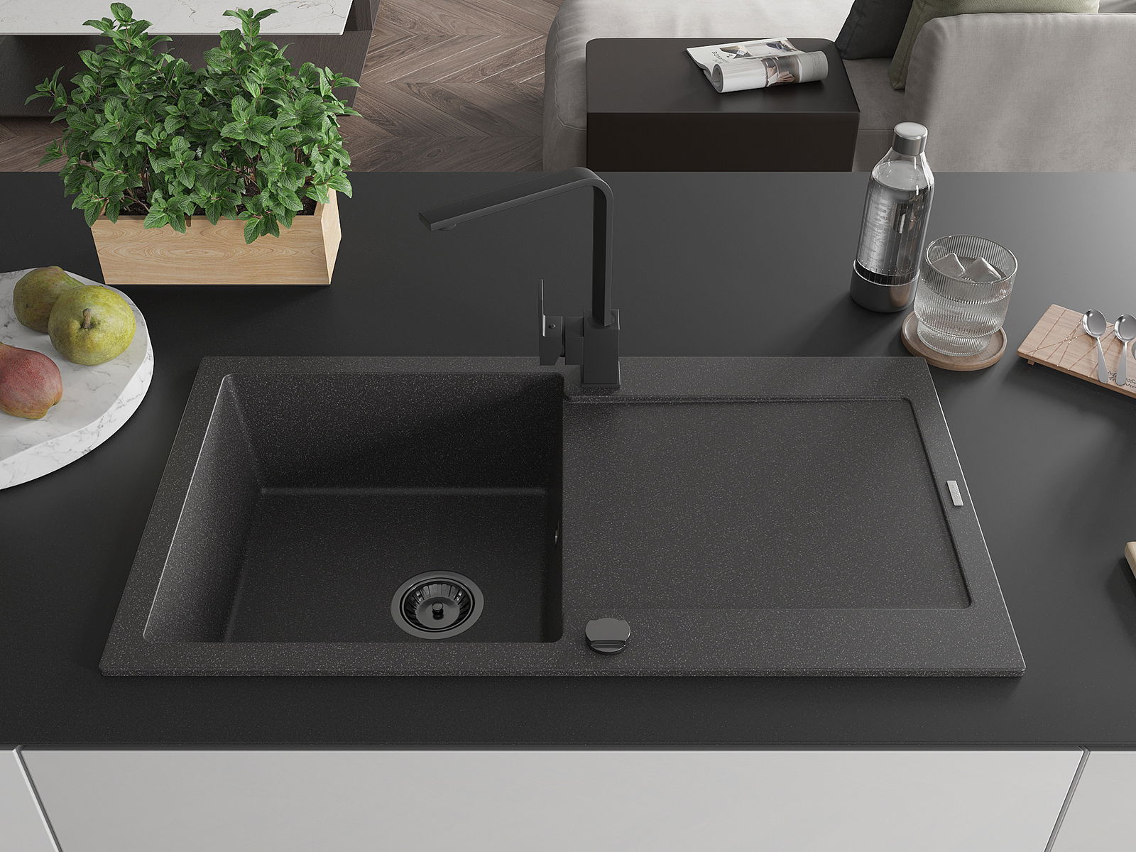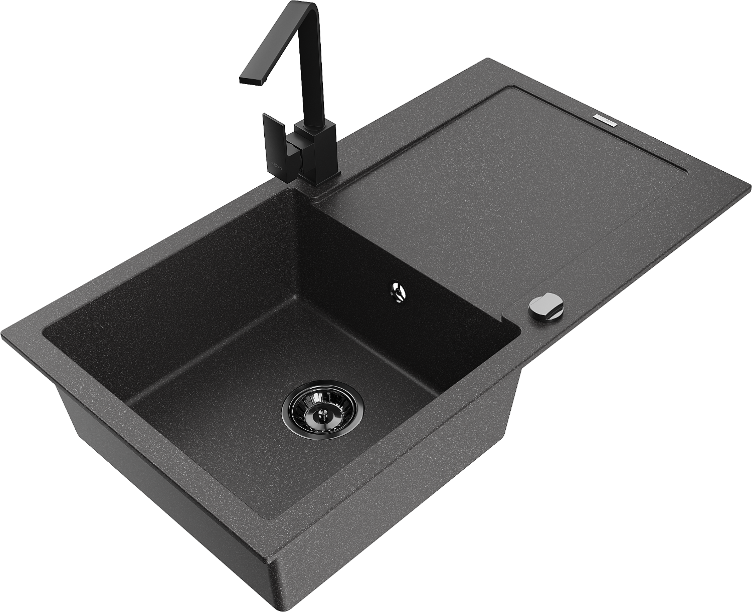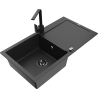 Mexen Leo granitā izlietne ar 1 nodalījumu, noteces virsmu un virtuves jaucējkrānu Rita, melni plankumaina