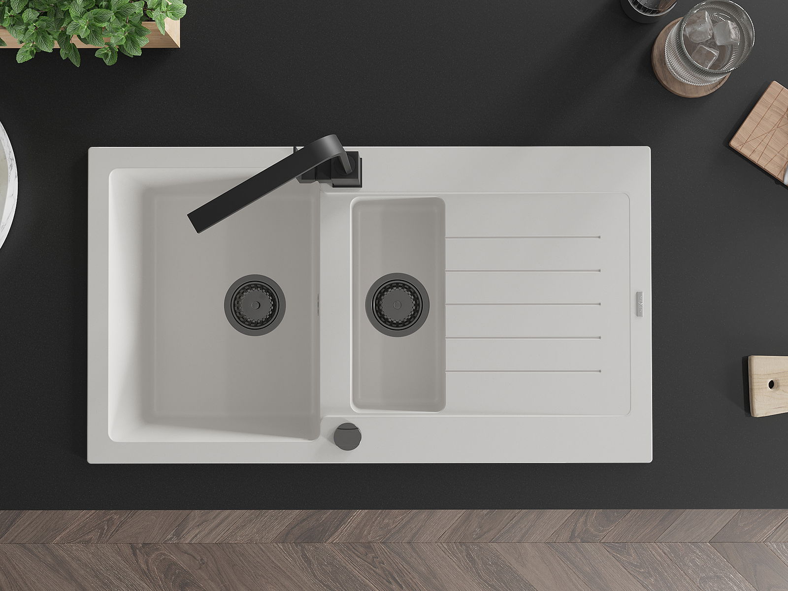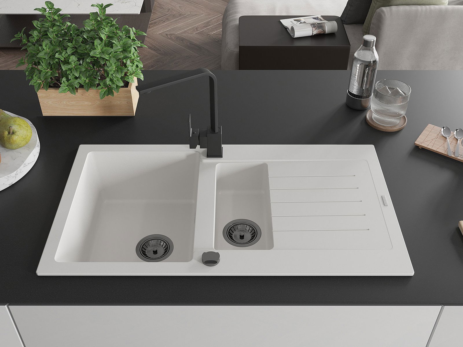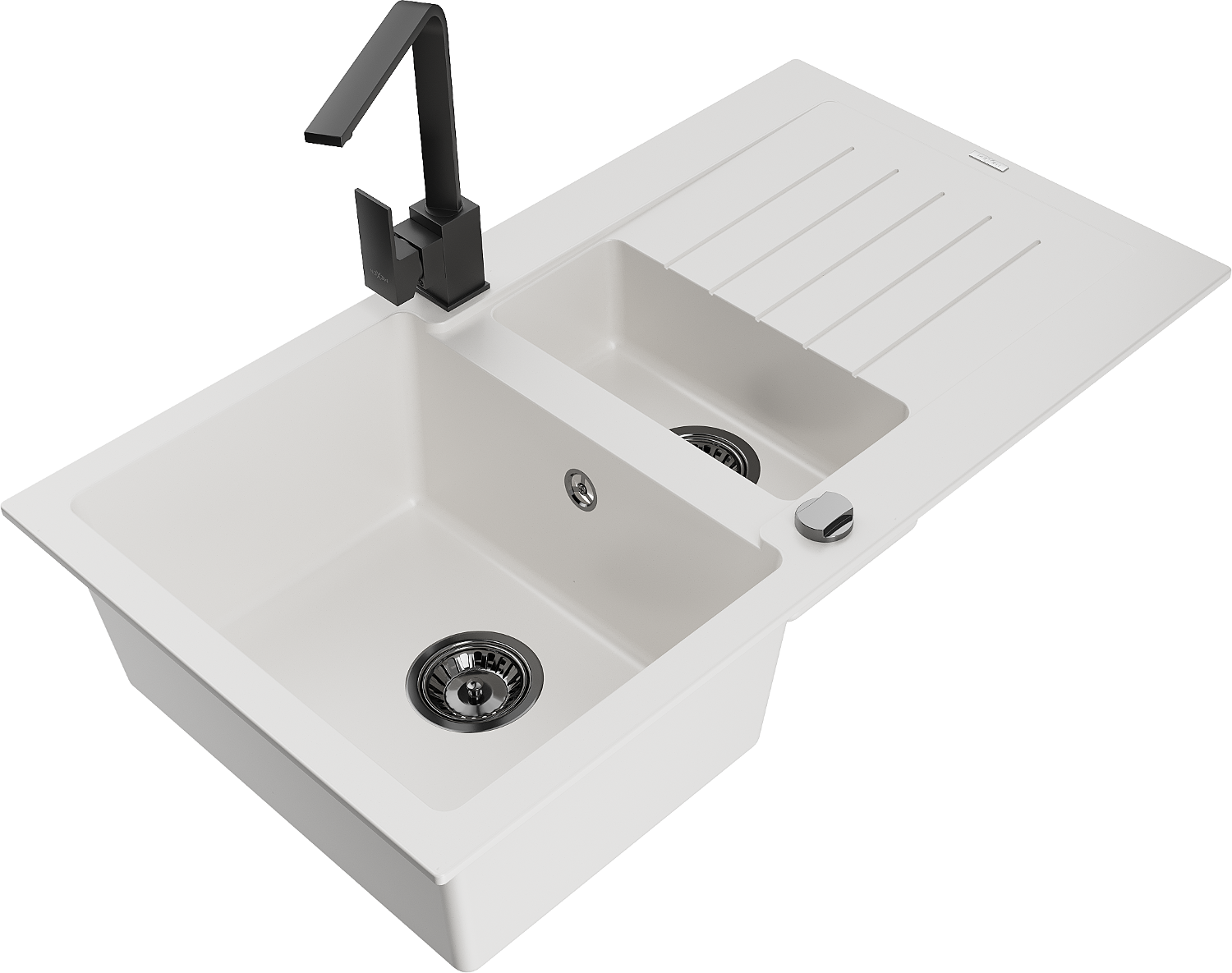 Mexen Matias granīta izlietne ar 1,5 nodalījumu un notekni un virtuves krānu Rita, balta - 6502-20-670300-70