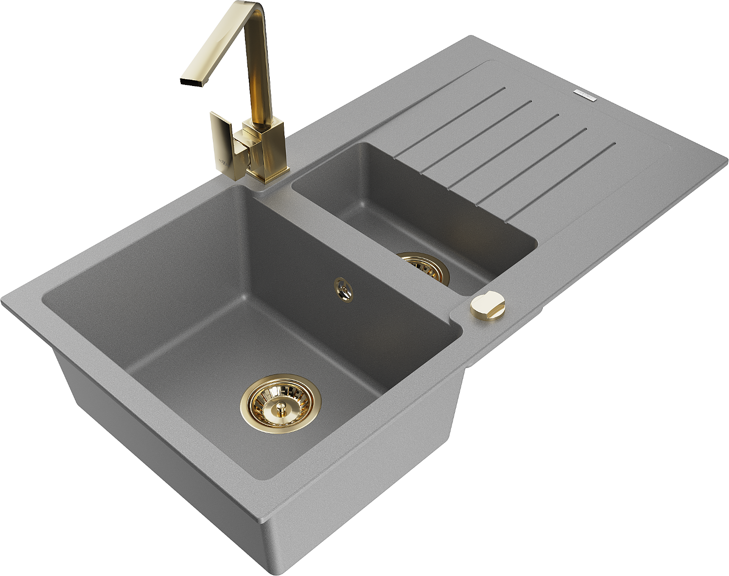 Mexen Matias granitais izlietnes ar 1,5 nodalījumu un notecētu un virtuves jaucējkrānu Rita, pelēks - 6502-71-670300-50