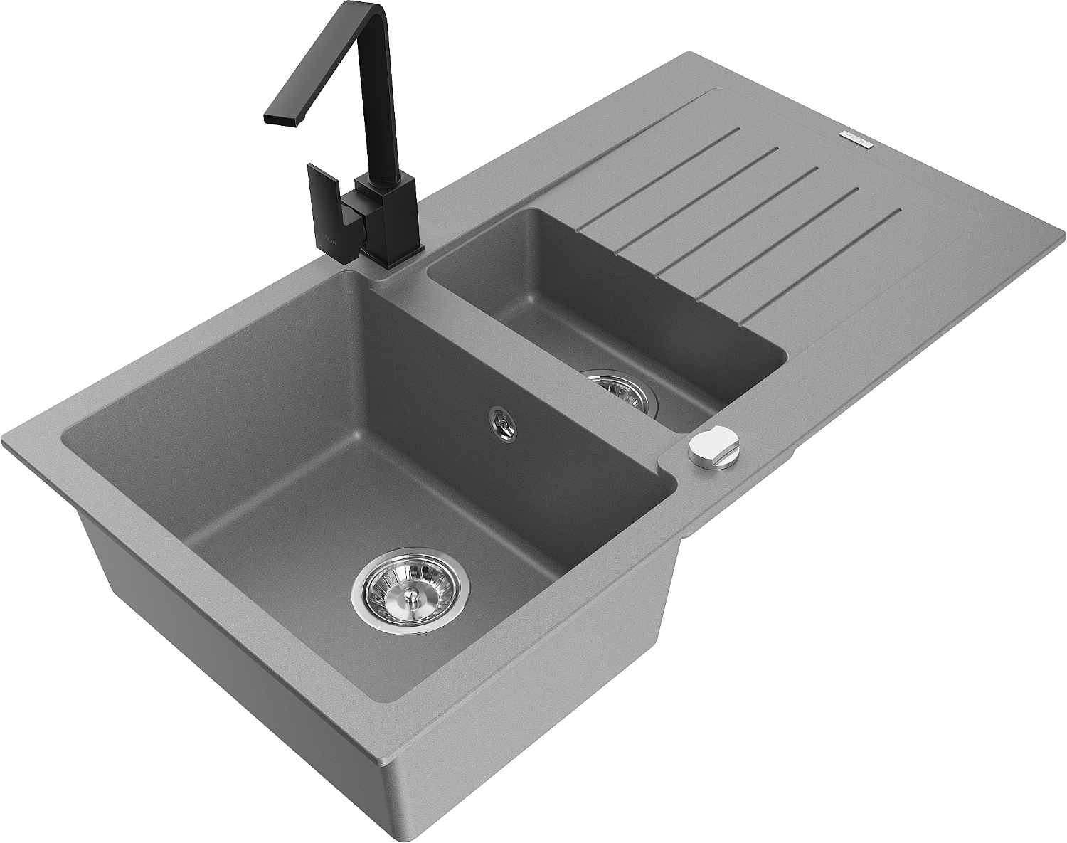Mexen Matias granīta izlietne ar 1,5 nodalījumu, ar noteces virsmu un virtuves jaucējkrānu Rita, pelēka - 6502-71-670300-70