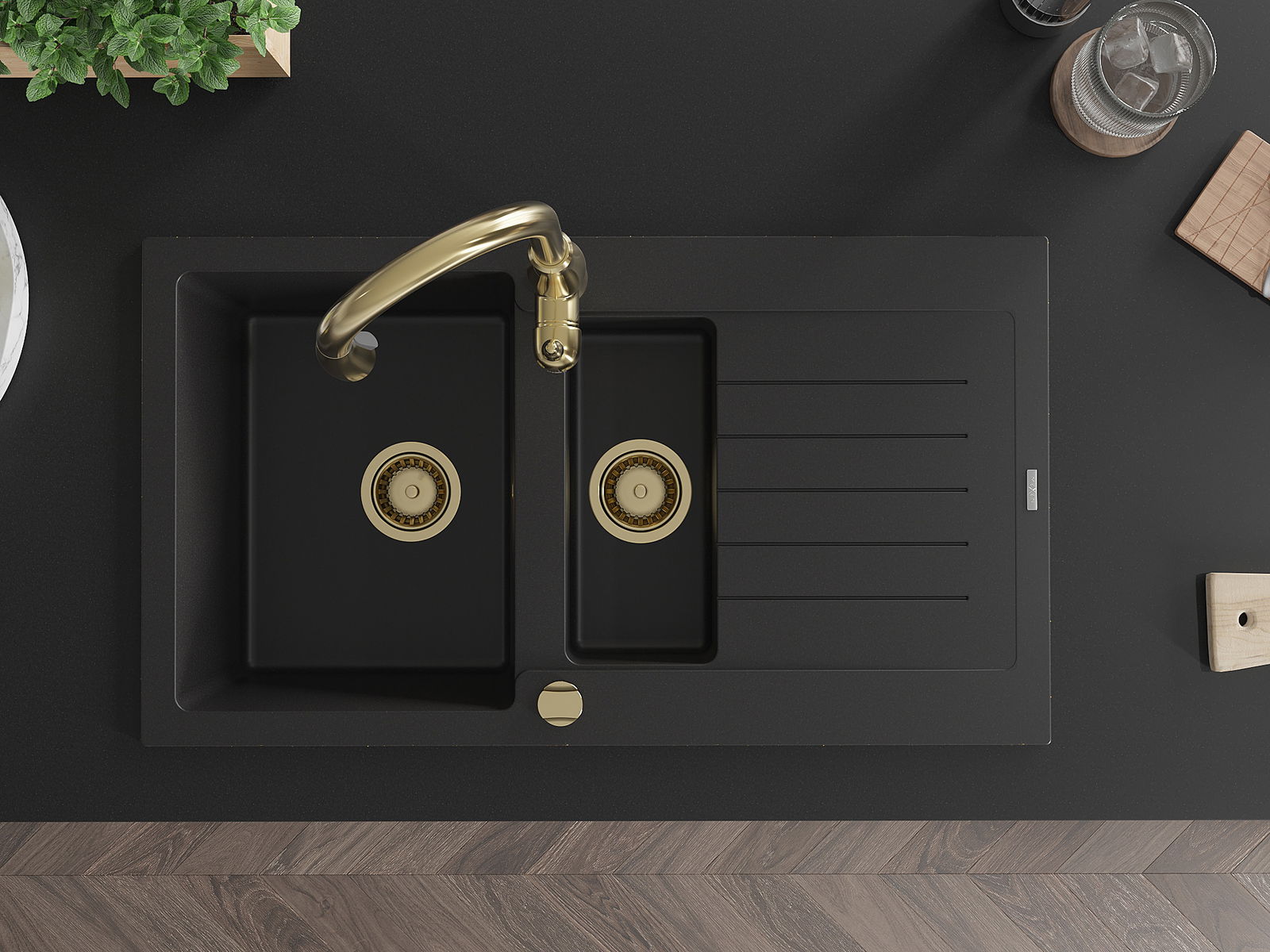 Mexen Matias granit izlietne ar 1,5 nodalījumiem un notekpaplāti un virtuves jaucējkrānu Savita, melna - 6502-77-672601-50